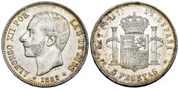 Centenario de la Peseta (1868-1931). Alfonso XII (1874-1885). 5 pesetas. 1885*18-87. Madrid. MSM. (Cal-62). Ag. 24,93 g. Acuñada bajo Alfonso XIII. Restos de brillo original. EBC-. Est...120,00.