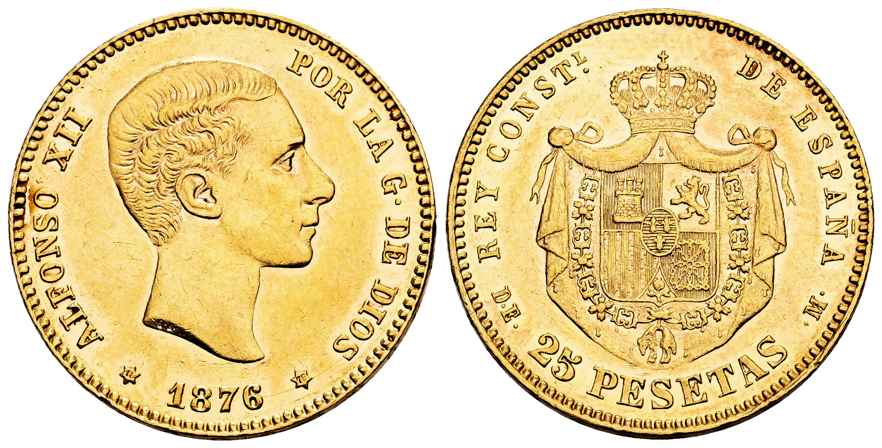 Centenario de la Peseta (1868-1931). Alfonso XII (1874-1885). 25 pesetas. 1876*18-76. Madrid. DEM. (Cal-67). Au. 8,05 g. Rayitas. Restos de brillo original. EBC. Est...800,00.