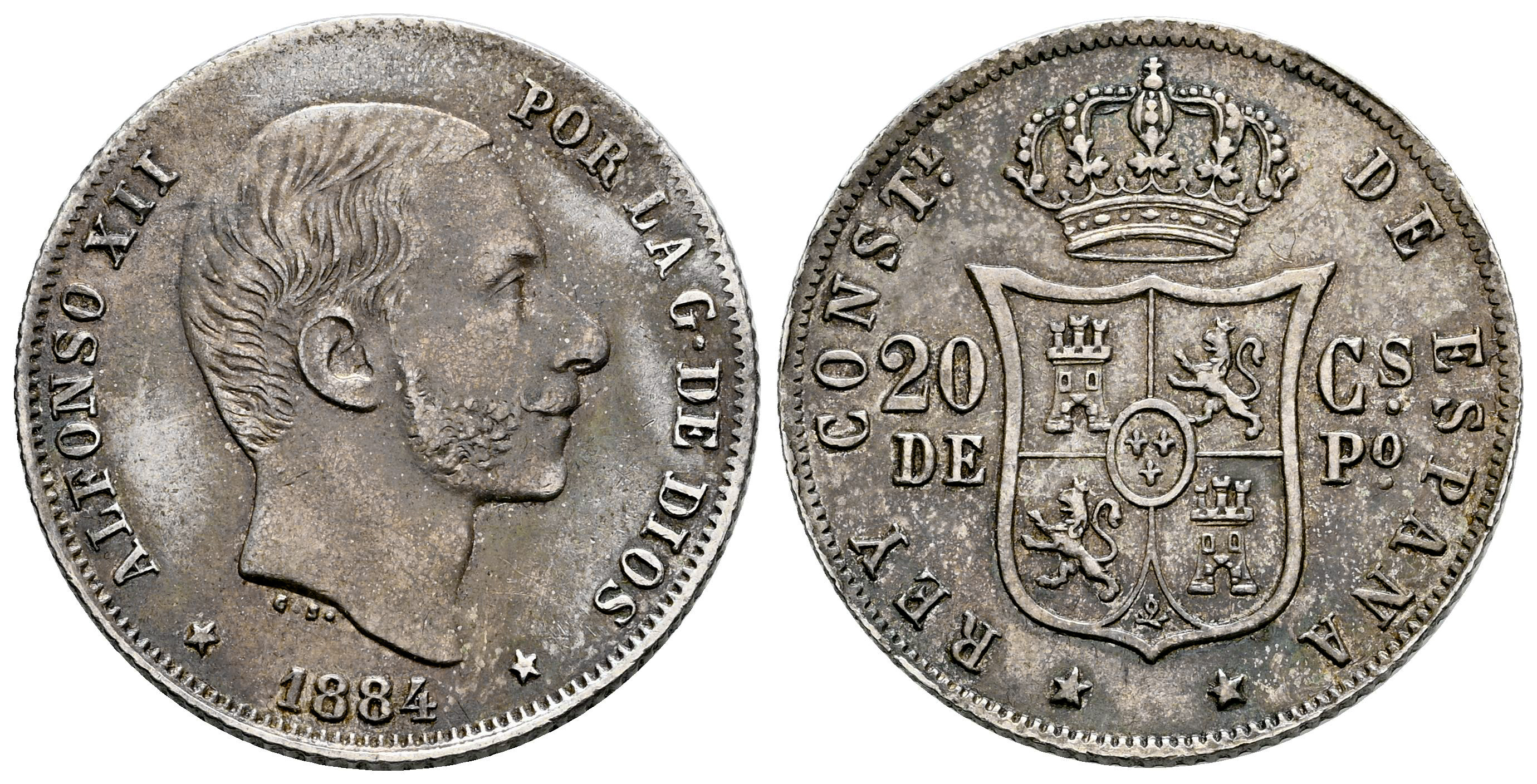 Centenario de la Peseta (1868-1931). Alfonso XII (1874-1885). 20 centavos. 1884. Manila. (Cal-110). Ag. 5,18 g. Tono. Muy escasa en esta conservación. EBC-. Est...300,00.