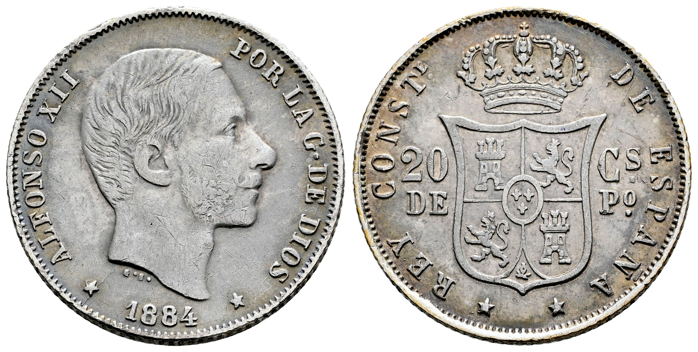 Centenario de la Peseta (1868-1931). Alfonso XII (1874-1885). 20 centavos. 1884. Manila. (Cal-110). Ag. 5,08 g. Golpecitos en el canto. Escasa. MBC. Est...45,00.