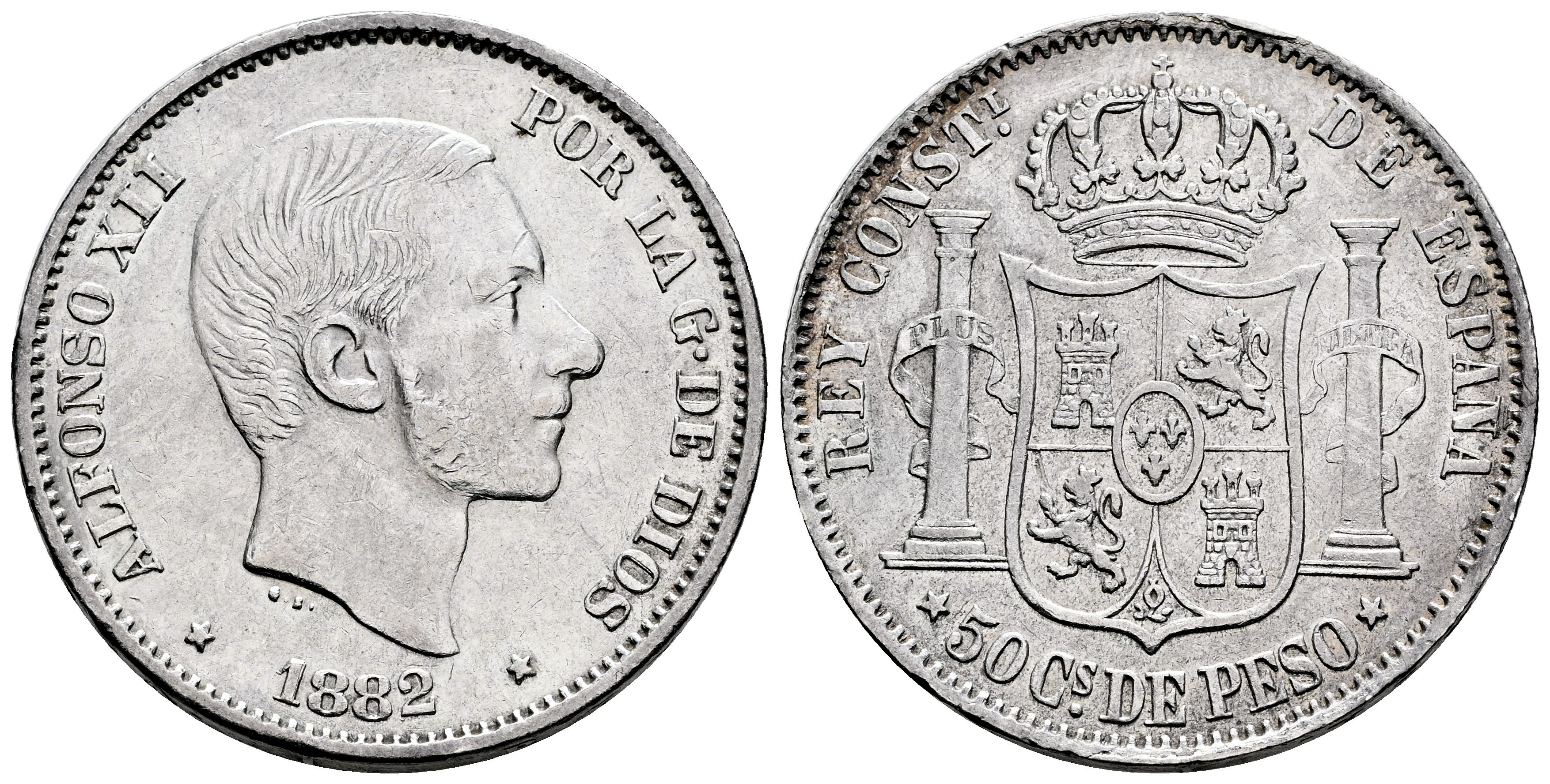 Centenario de la Peseta (1868-1931). Alfonso XII (1874-1885). 50 centavos. 1882. Manila. (Cal-118). Ag. 13,04 g. Ligeramente limpiada. MBC+. Est...45,00.