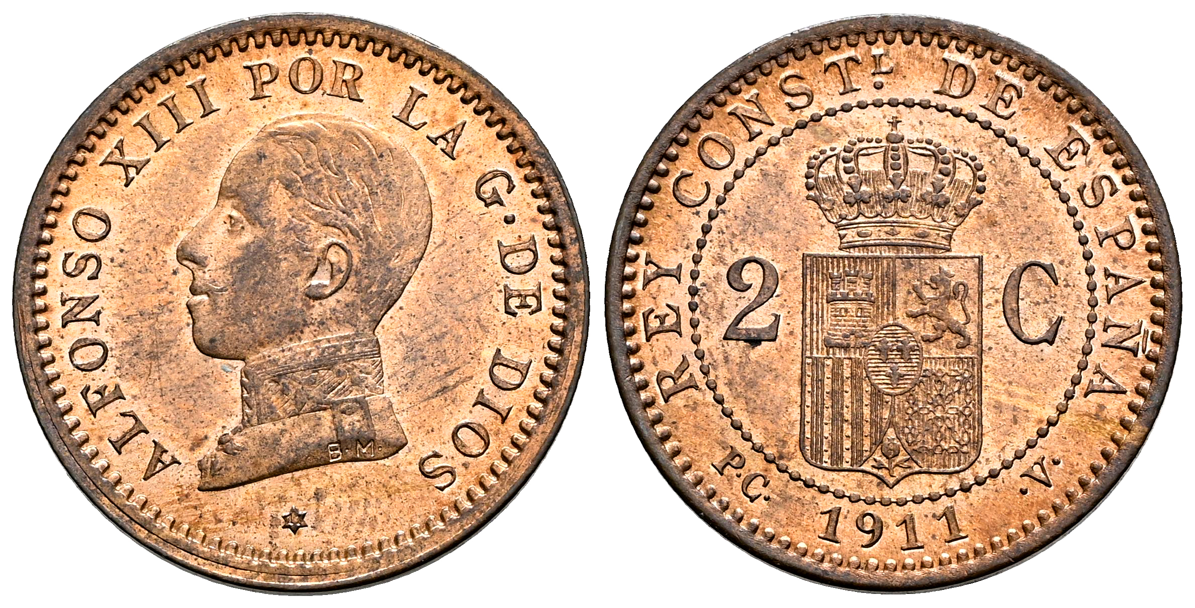 Centenario de la Peseta (1868-1931). Alfonso XIII (1886-1931). 2 céntimos. 1911*11. Madrid. PCV. (Cal-13). Ae. 2,04 g. Pleno brillo original. SC. Est...25,00.