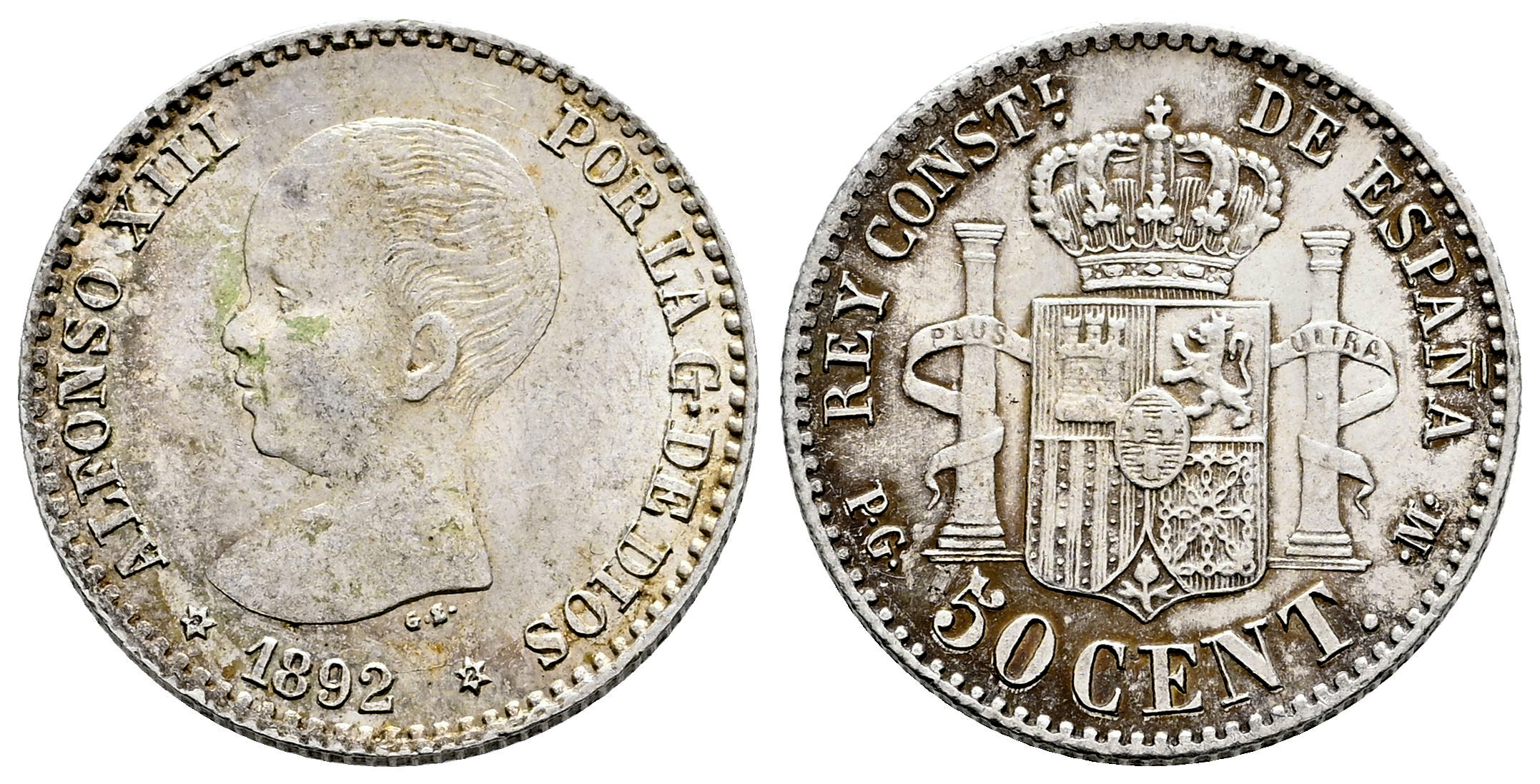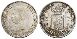 Centenario de la Peseta (1868-1931). Alfonso XIII (1886-1931). 50 céntimos. 1892*9-2. Madrid. PGM. (Cal-38). Ag. 2,50 g. Pequeños restos de brillo original. EBC-/MBC+. Est...30,00.