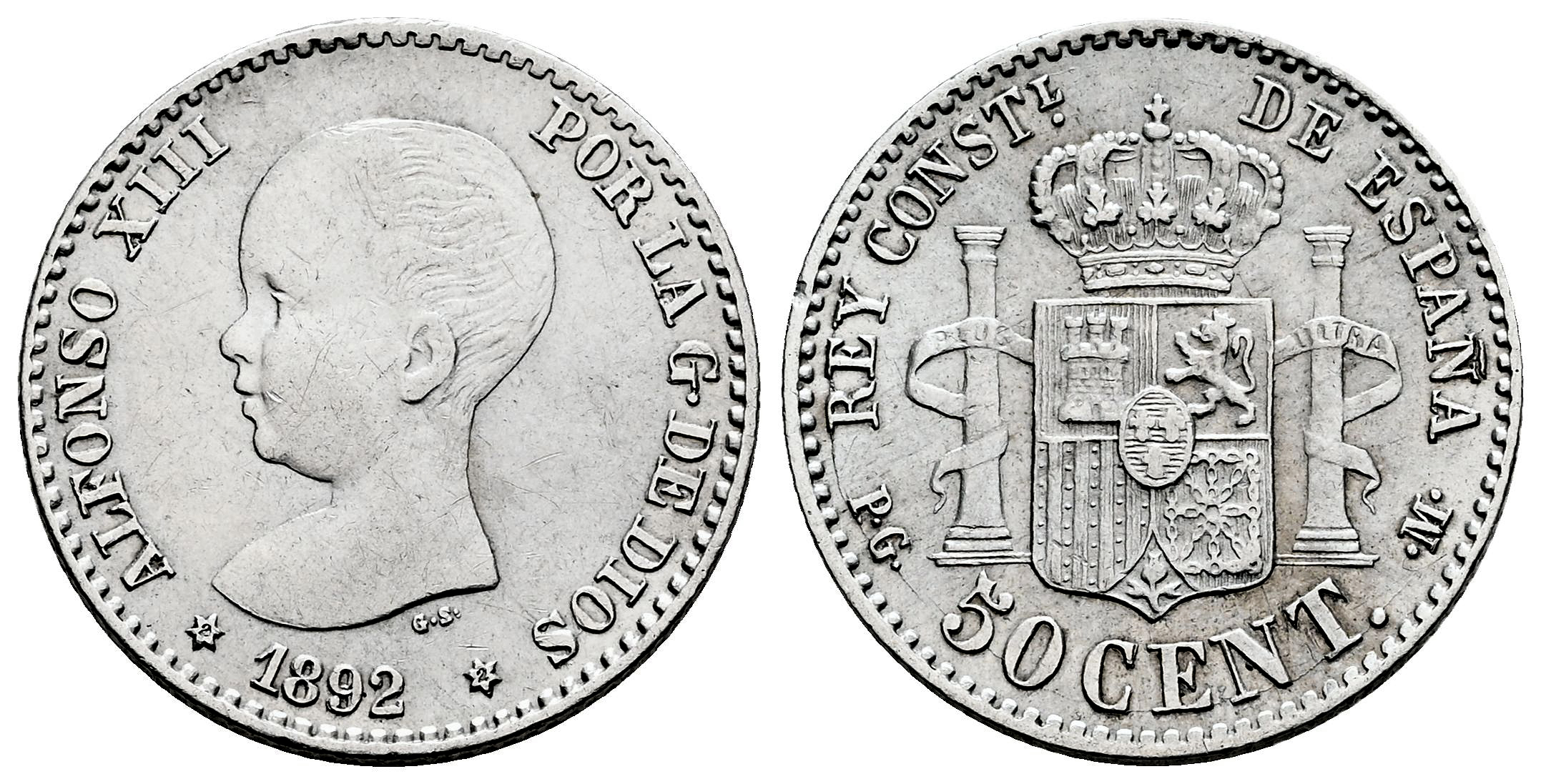 Centenario de la Peseta (1868-1931). Alfonso XIII (1886-1931). 50 céntimos. 1892*2-2. Madrid. PGM. (Cal-40). Ag. 2,48 g. Ligeramente limpiada. EBC-. Est...50,00.