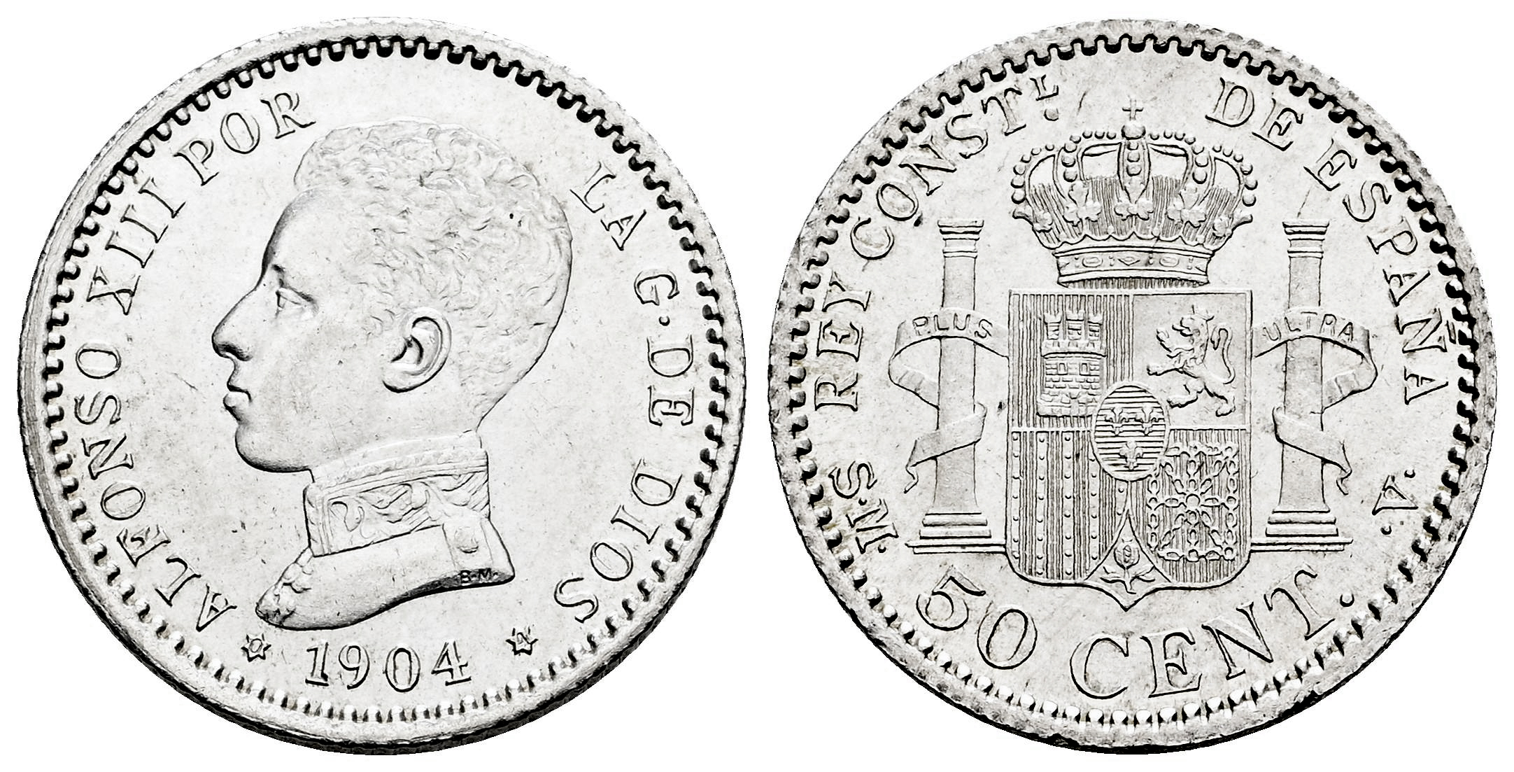 Centenario de la Peseta (1868-1931). Alfonso XIII (1886-1931). 50 céntimos. 1904*0-4. Madrid. SMV. (Cal-46). Ag. 2,52 g. Pleno brillo original. SC. Est...30,00.