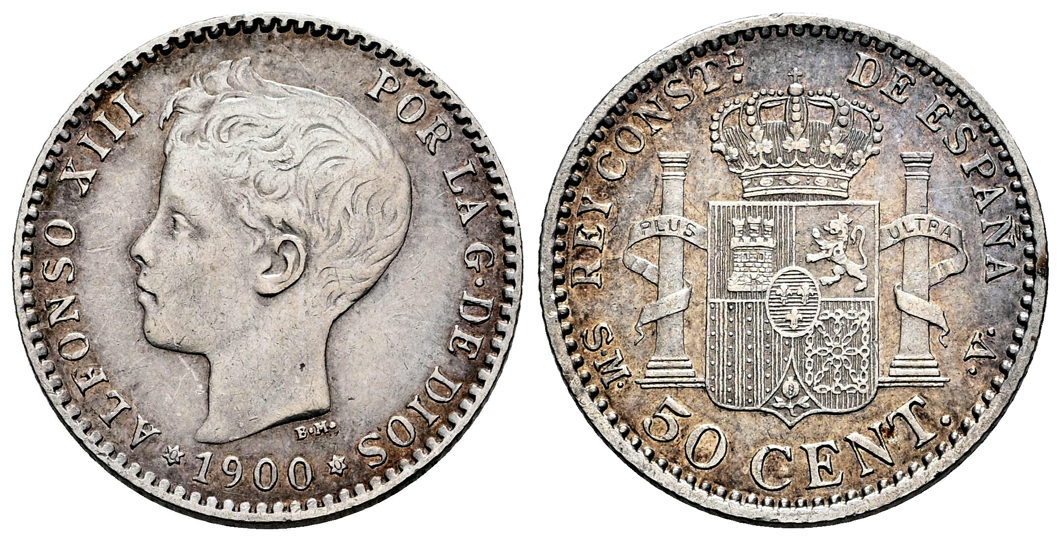 Centenario de la Peseta (1868-1931). Alfonso XIII (1886-1931). 50 céntimos. 1900*0-0. Madrid. SMV. (Cal-45). Ag. 2,52 g. Ligero tono. EBC-. Est...35,00.