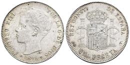 Centenario de la Peseta (1868-1931). Alfonso XIII (1886-1931). 1 peseta. 1896*18-96. Madrid. PGV. (Cal-56). Ag. 5,02 g. Ligero tono. Golpecito en el canto. Brillo original. EBC+. Est...80,00.