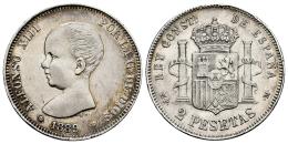 Centenario de la Peseta (1868-1931). Alfonso XIII (1886-1931). 2 pesetas. 1889*18-89. Madrid. MPM. (Cal-82). Ag. 10,01 g. Golpecitos en el canto y rayita en el cuello. MBC+. Est...120,00.