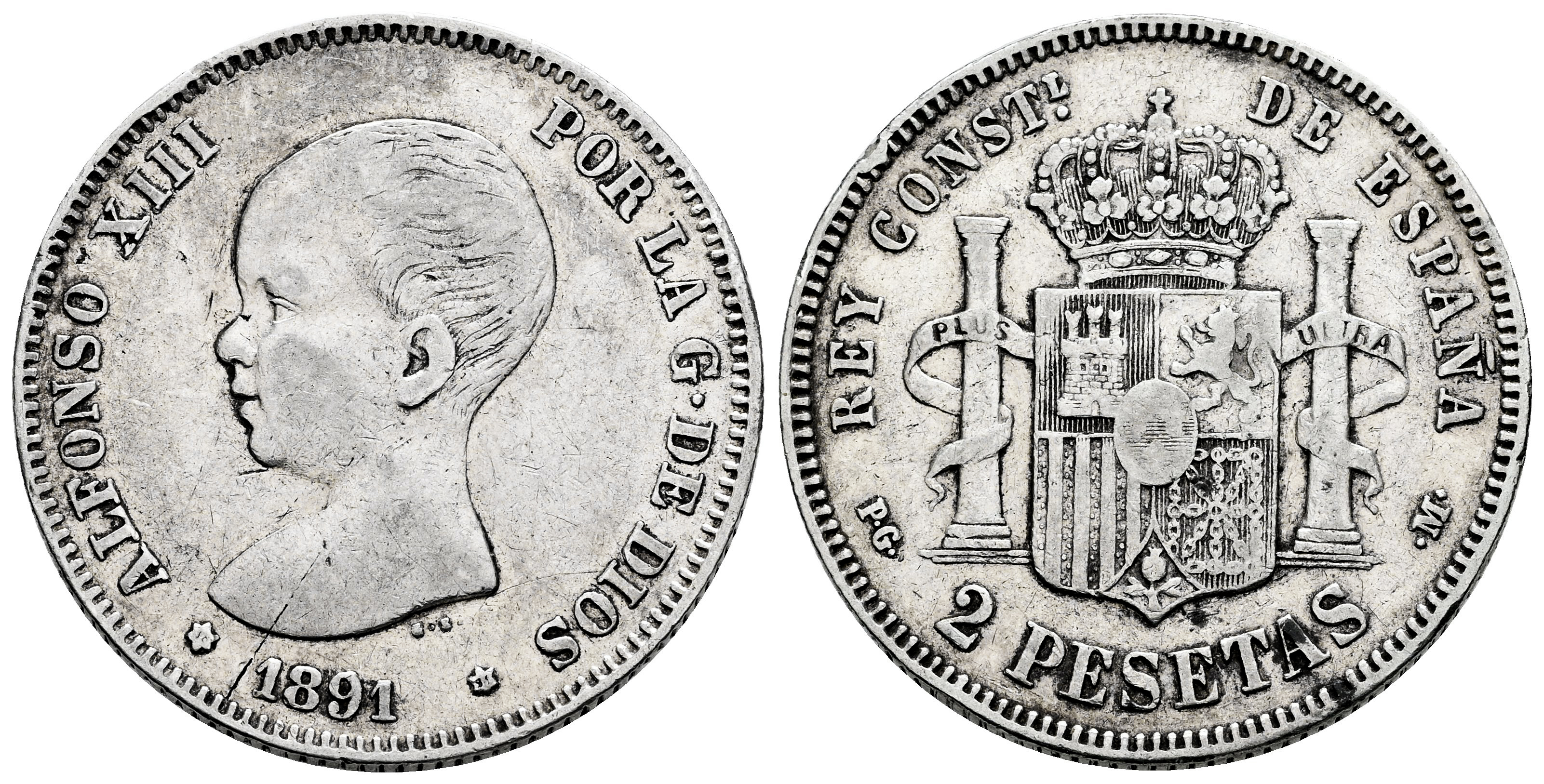 Centenario de la Peseta (1868-1931). Alfonso XIII (1886-1931). 2 pesetas. 1891*18-91. Madrid. PGM. (Cal-84). Ag. 9,97 g. Estrellas tenues. Golpecitos en el canto. Escasa. MBC. Est...70,00.