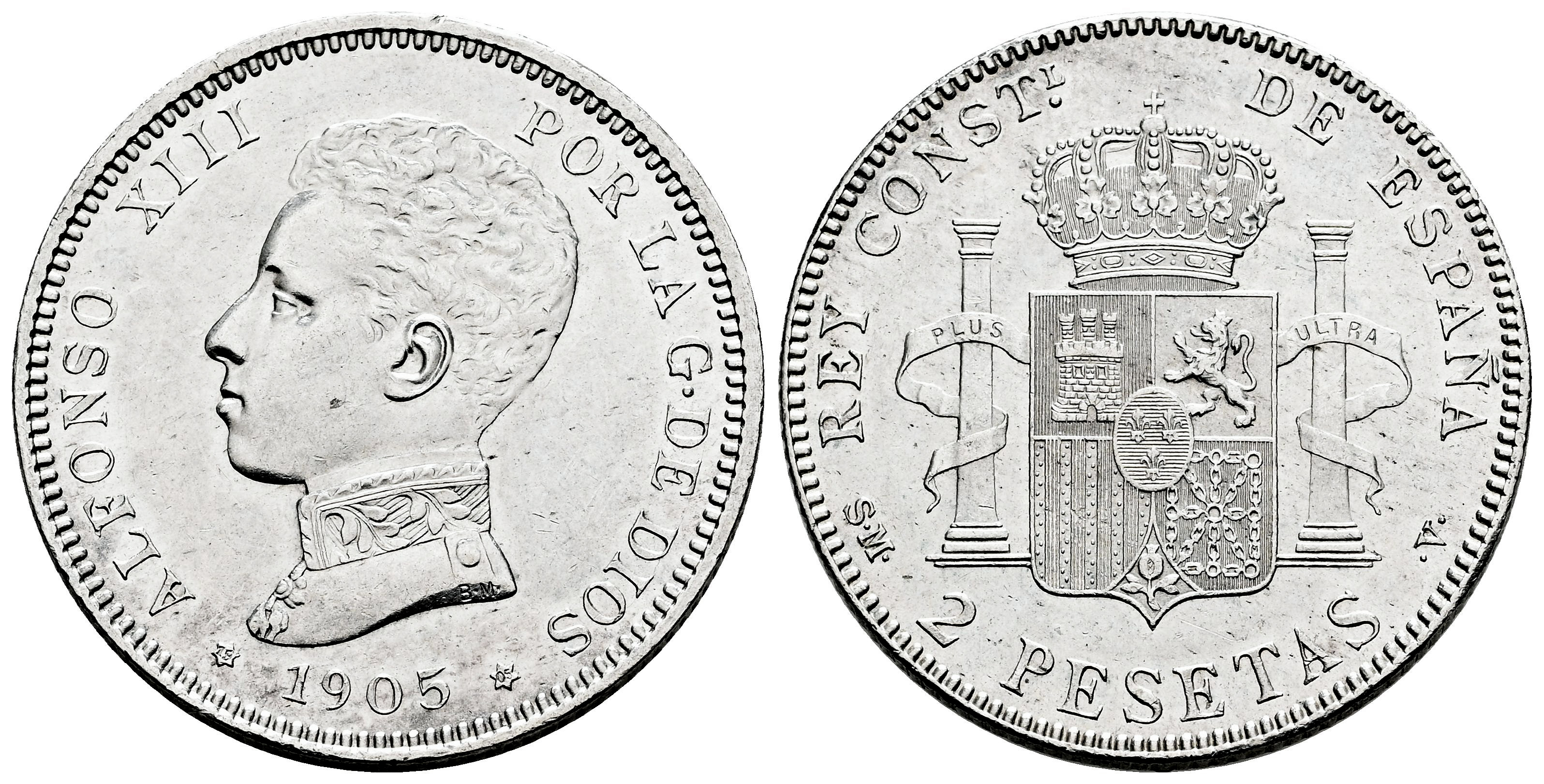 Centenario de la Peseta (1868-1931). Alfonso XIII (1886-1931). 2 pesetas. 1905*19-05. Madrid. SMV. (Cal-88). Ag. 9,99 g. Rayitas. Brillo original. Ex Soler&Llach (25/10/2018), lote 130. SC-. Est...45,00.