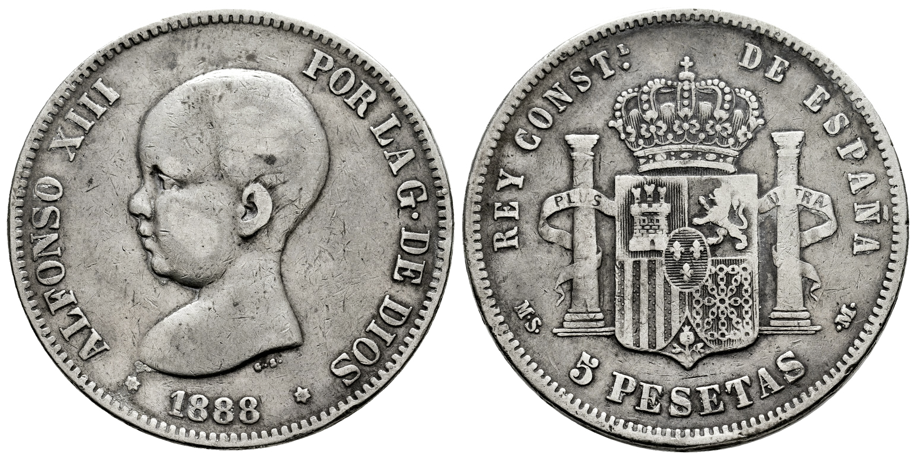 Centenario de la Peseta (1868-1931). Alfonso XIII (1886-1931). 5 pesetas. 1888*18-88. Madrid. MSM. (Cal-89). Ag. 24,47 g. Rara. BC+. Est...750,00.