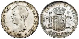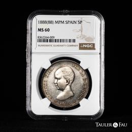 Centenario de la Peseta (1868-1931). Alfonso XIII (1886-1931). 5 pesetas. 1888*18-88. Madrid. MPM. (Cal-92). Ag. Brillo original. Encapsulada por NGC como MS 60. Est...300,00.