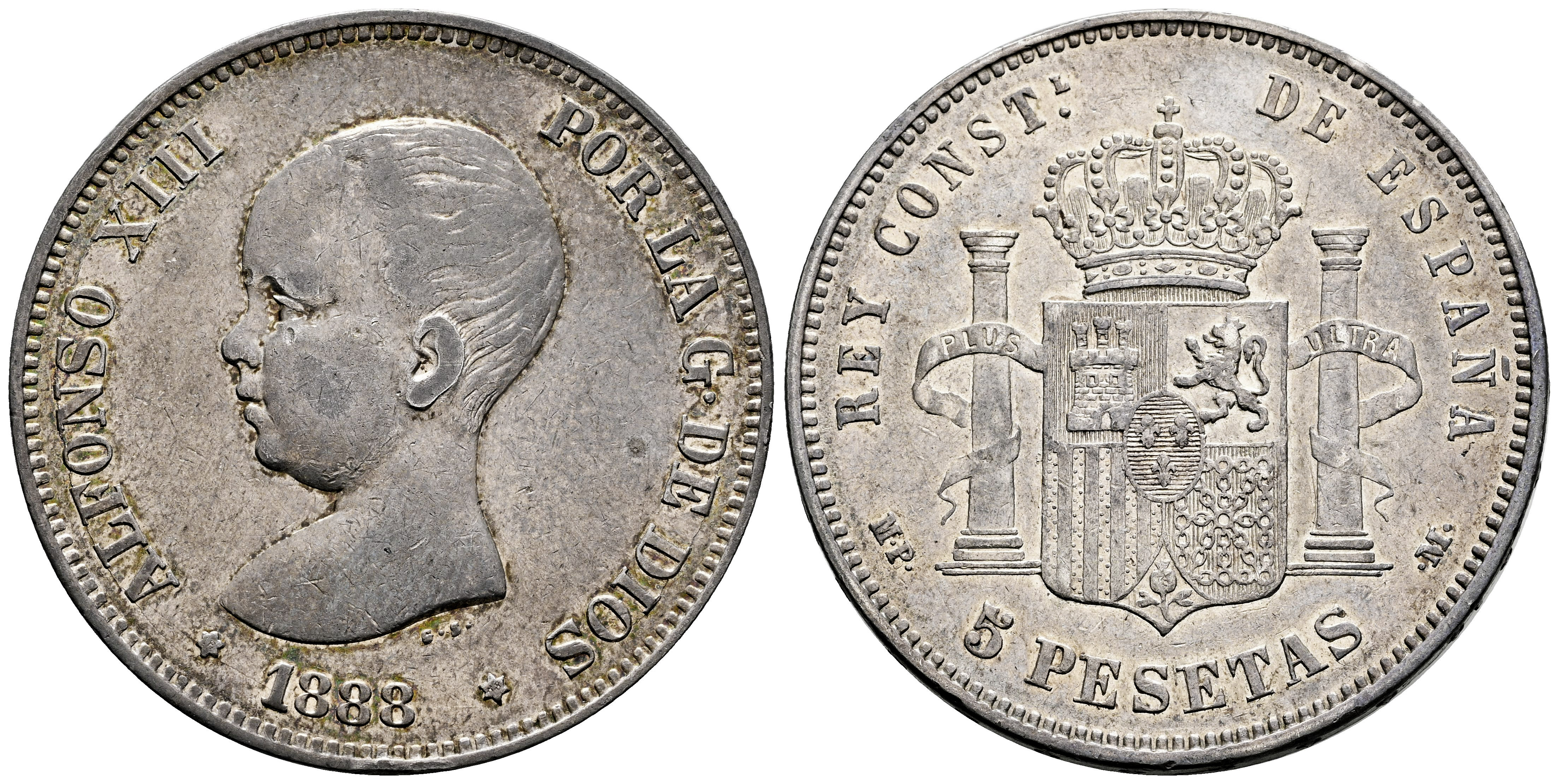 Centenario de la Peseta (1868-1931). Alfonso XIII (1886-1931). 5 pesetas. 1888*_8-88. Madrid. MPM. (Cal-92). Ag. 25,00 g. Pátina. Pequeños restos de brillo original. MBC+. Est...50,00.