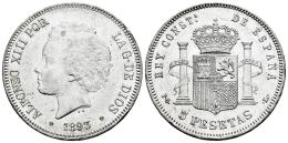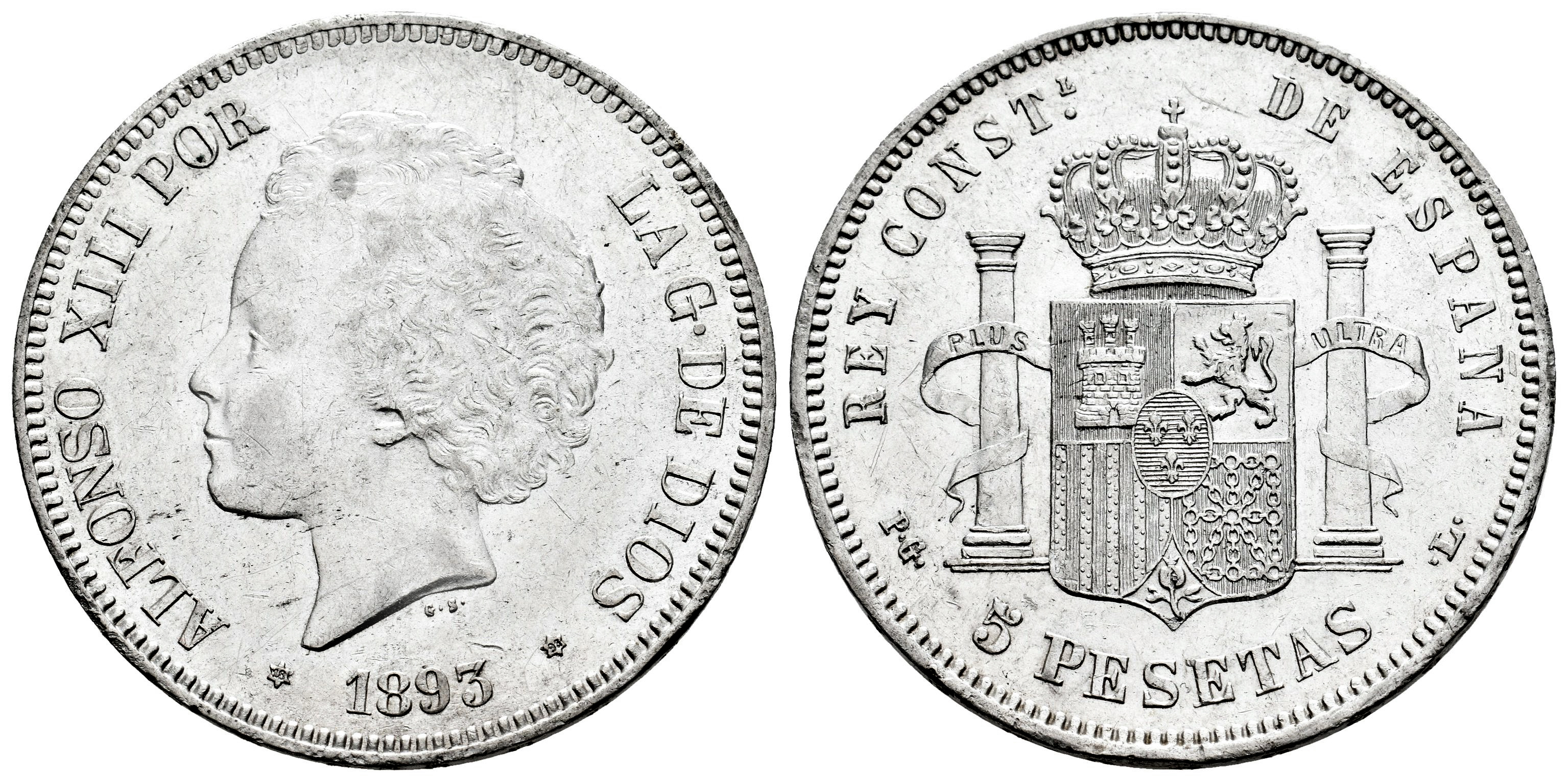 Centenario de la Peseta (1868-1931). Alfonso XIII (1886-1931). 5 pesetas. 1893 *18-93. Madrid. PGL. (Cal-102). Ag. 25,00 g. Restos de brillo original. Leves marquitas. Atractiva. EBC-. Est...150,00.