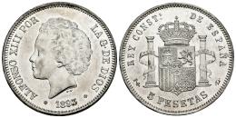 Centenario de la Peseta (1868-1931). Alfonso XIII (1886-1931). 5 pesetas. 1893*18-93. Madrid. PGL. (Cal-103). Ag. 24,94 g. Pequeñas marcas. Pleno brillo original. Golpecitos en el canto. Escasa en esta conservación. EBC+. Est...500,00.