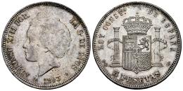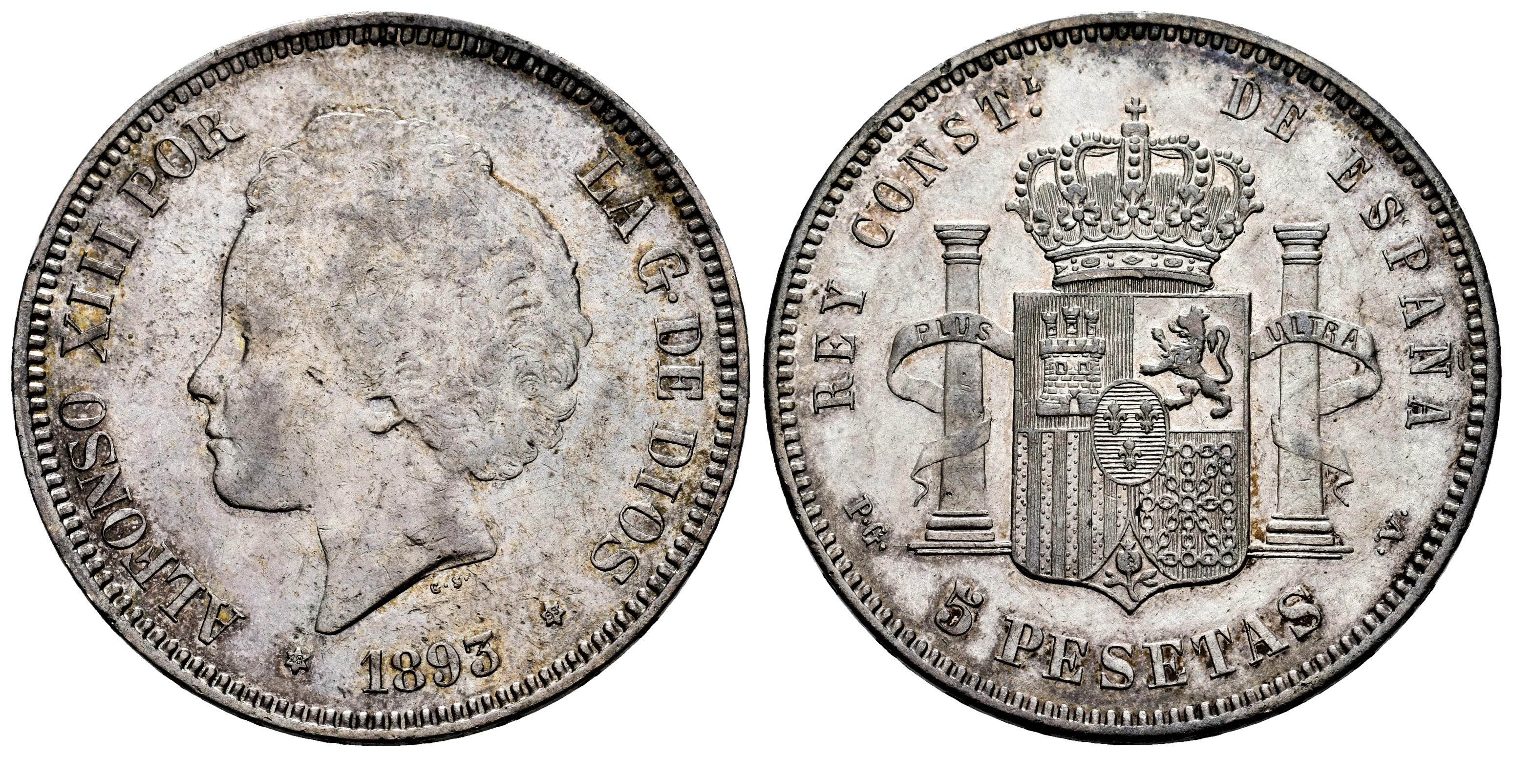 Centenario de la Peseta (1868-1931). Alfonso XIII (1886-1931). 5 pesetas. 1893*18-93. Madrid. PGV. (Cal-103). Ag. 25,02 g. Ligera pátina de monetario. Escasa. EBC-. Est...200,00.