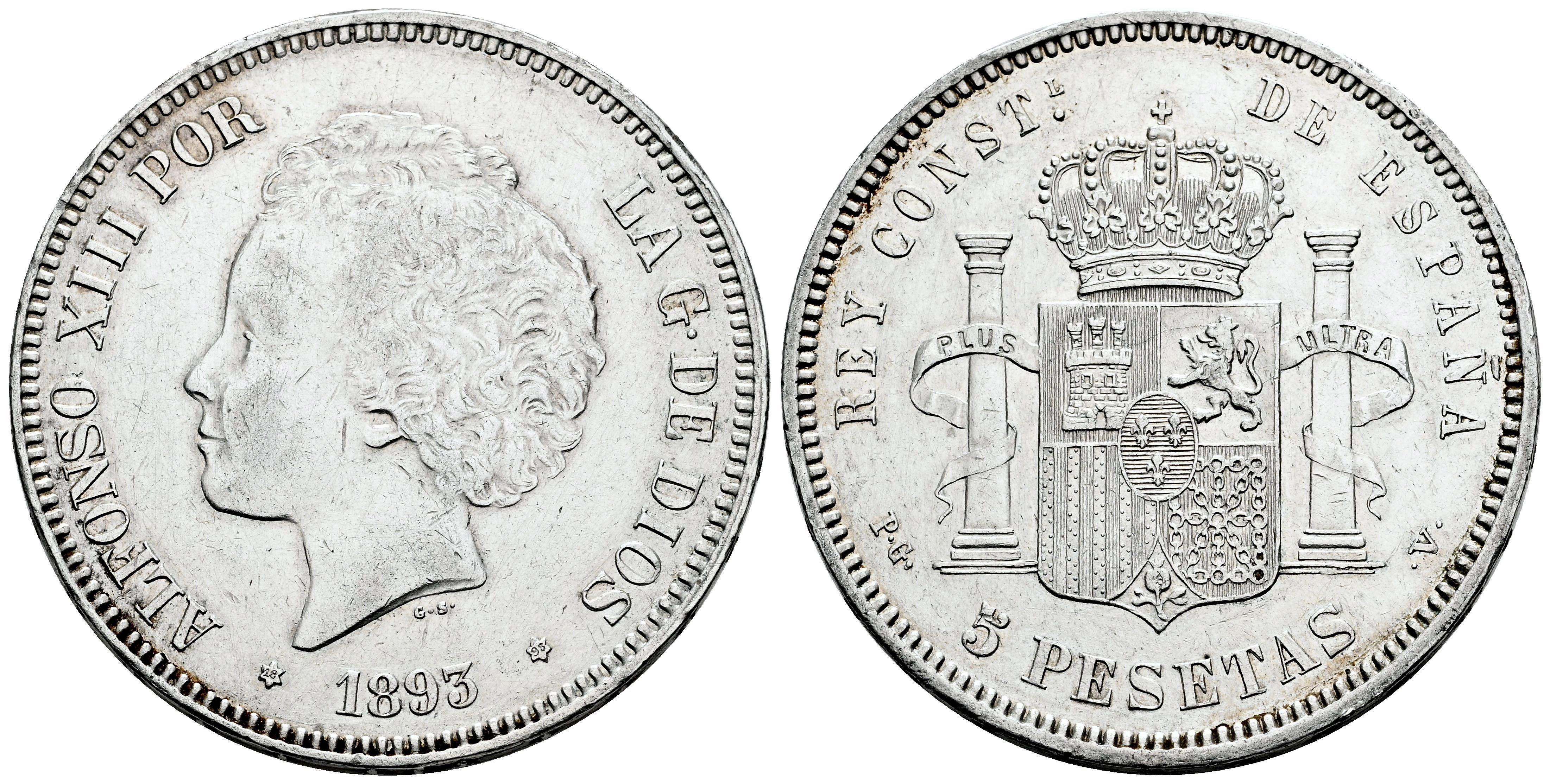 Centenario de la Peseta (1868-1931). Alfonso XIII (1886-1931). 5 pesetas. 1893*18-93. Madrid. PGV. (Cal-103). Ag. 25,06 g. Rayitas. Limpiada. EBC-. Est...200,00.