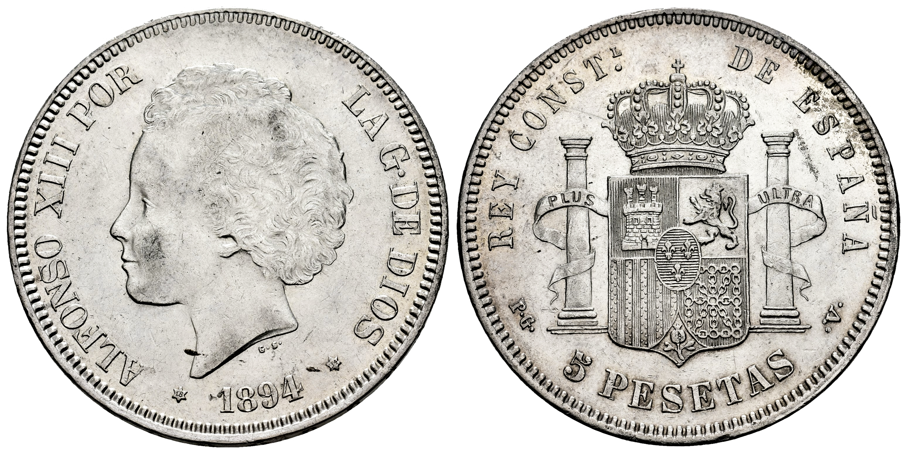 Centenario de la Peseta (1868-1931). Alfonso XIII (1886-1931). 5 pesetas. 1894*18-94. Madrid. PGV. (Cal-104). Ag. 24,81 g. Restos de brillo original . MBC+/EBC-. Est...90,00.