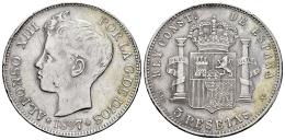 Centenario de la Peseta (1868-1931). Alfonso XIII (1886-1931). 5 pesetas. 1897*18-81. Madrid. SGV. (Barrera-1352). Ag. 24,93 g. Falsa de época en plata. Limpiada. MBC. Est...55,00.