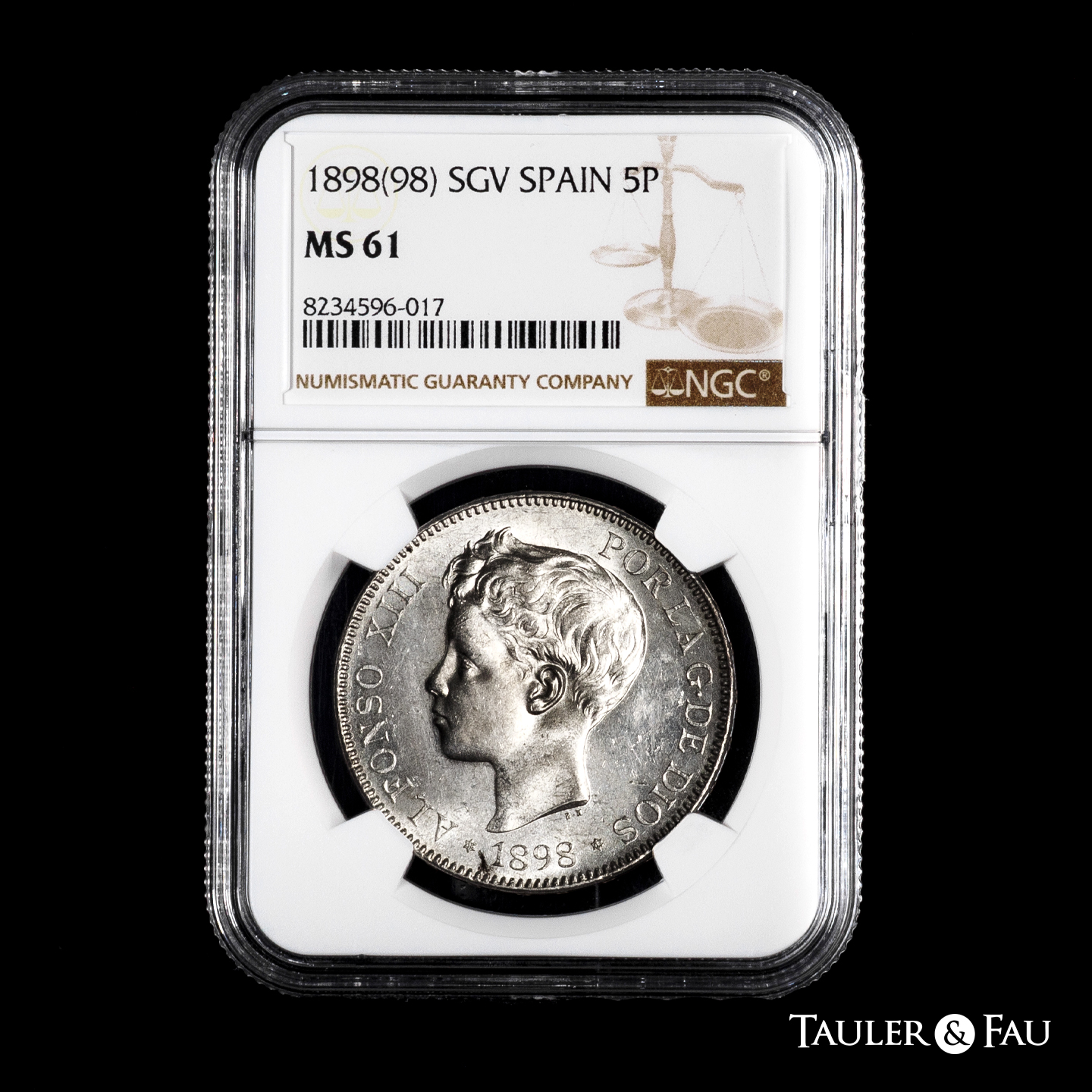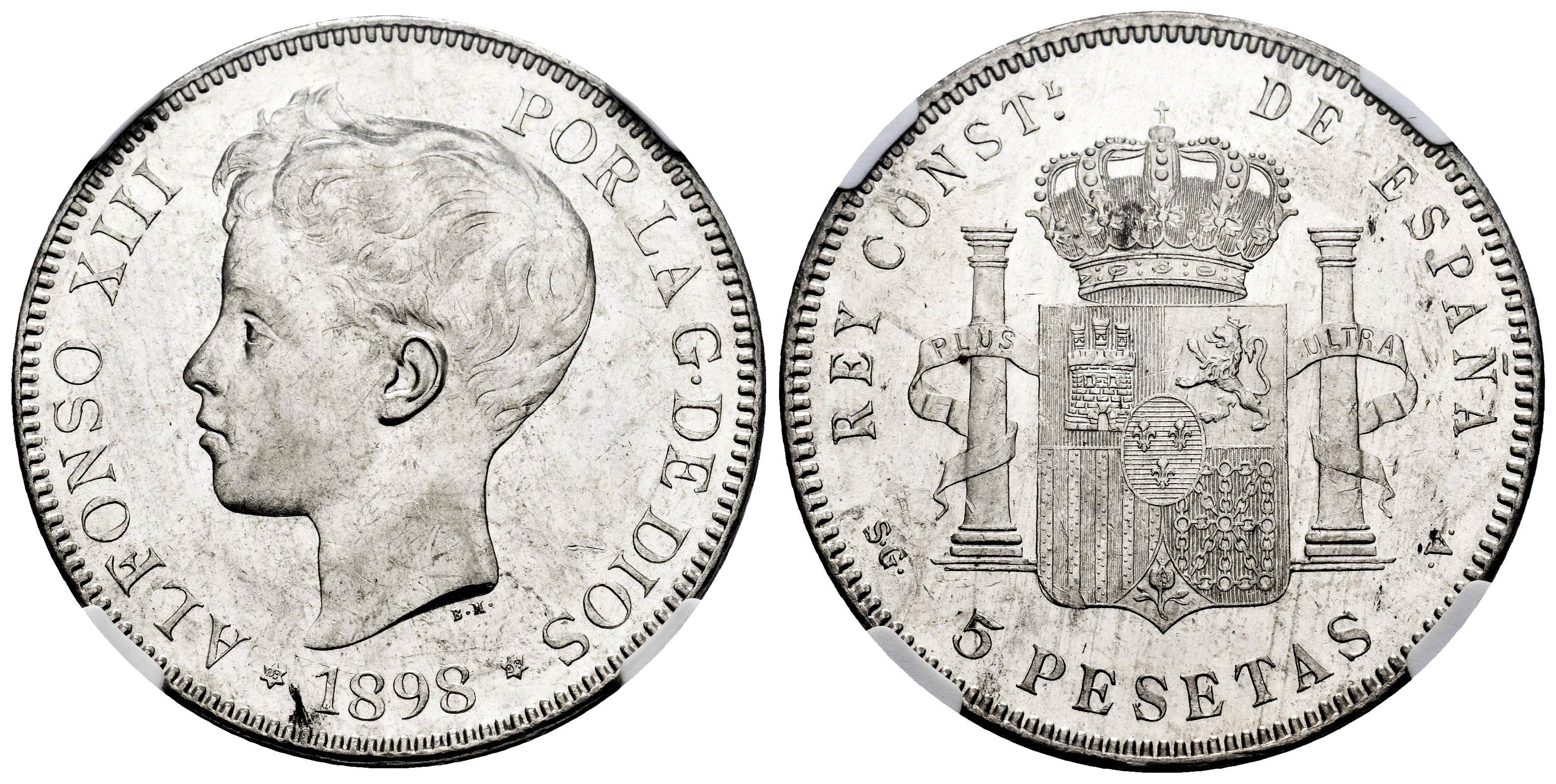 Centenario de la Peseta (1868-1931). Alfonso XIII (1886-1931). 5 pesetas. 1898*18-98. Madrid. SGV. (Cal-109). Ag. Brillo original. Encapsulada por NGC como MS 61. Est...120,00.