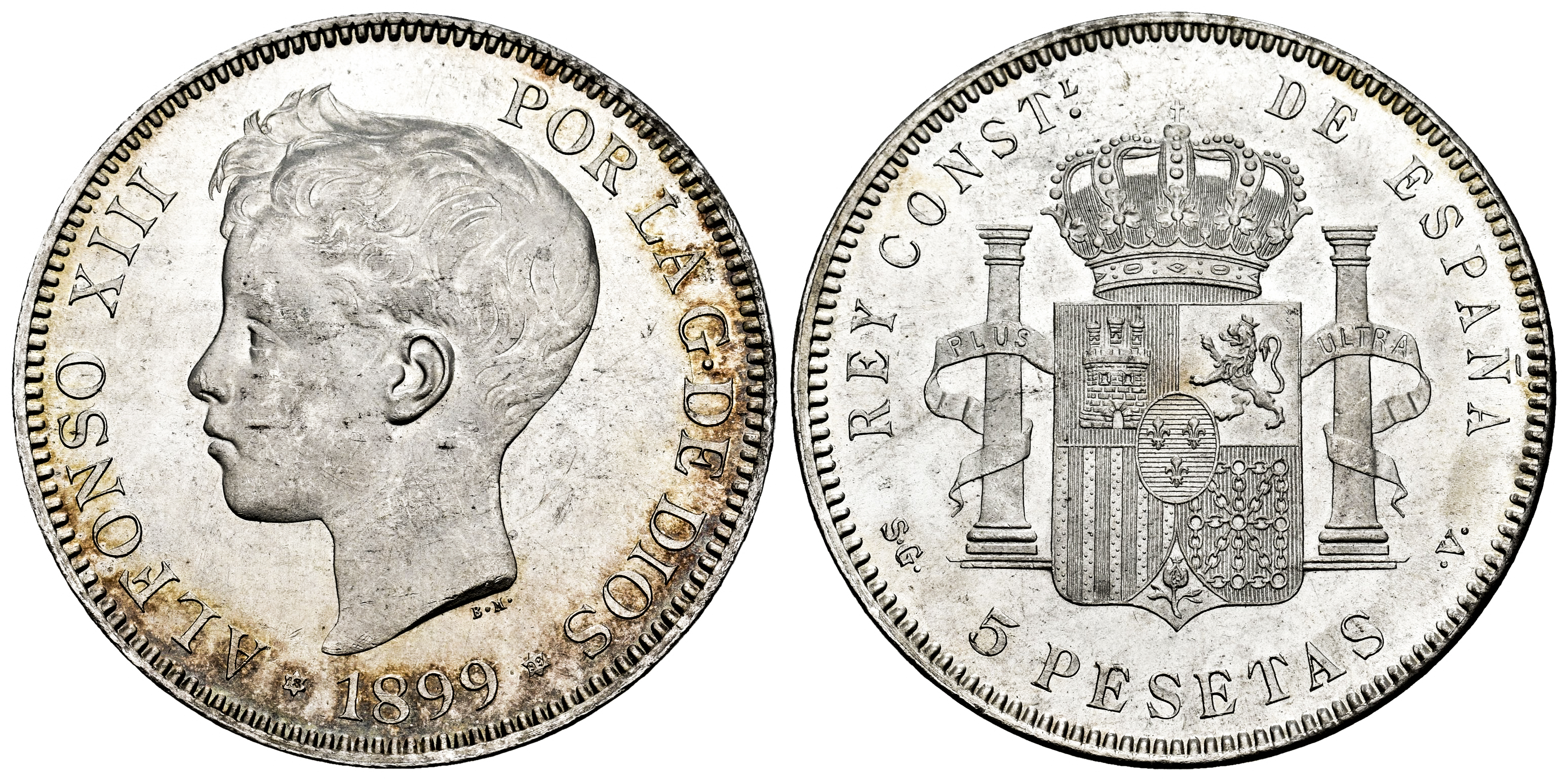 Centenario de la Peseta (1868-1931). Alfonso XIII (1886-1931). 5 pesetas. 1899*18-99. Madrid. SGV. (Cal-110). Ag. Brillo original. Encapsulada por NGC como MS 63. Est...250,00.