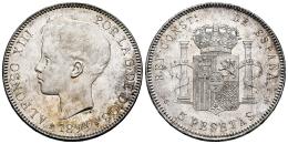 Centenario de la Peseta (1868-1931). Alfonso XIII (1886-1931). 5 pesetas. 1899*18-99. Madrid. SGV. (Cal-110). Ag. 24,93 g. Ligero tono. Brillo original. SC. Est...150,00.