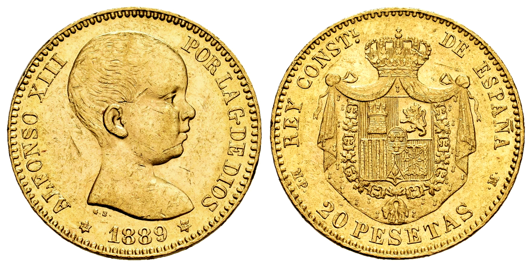 Centenario de la Peseta (1868-1931). Alfonso XIII (1886-1931). 20 pesetas. 1889*18-89. Madrid. MPM. (Cal-113). Au. 6,45 g. Golpecitos. Brillo original. EBC. Est...550,00.