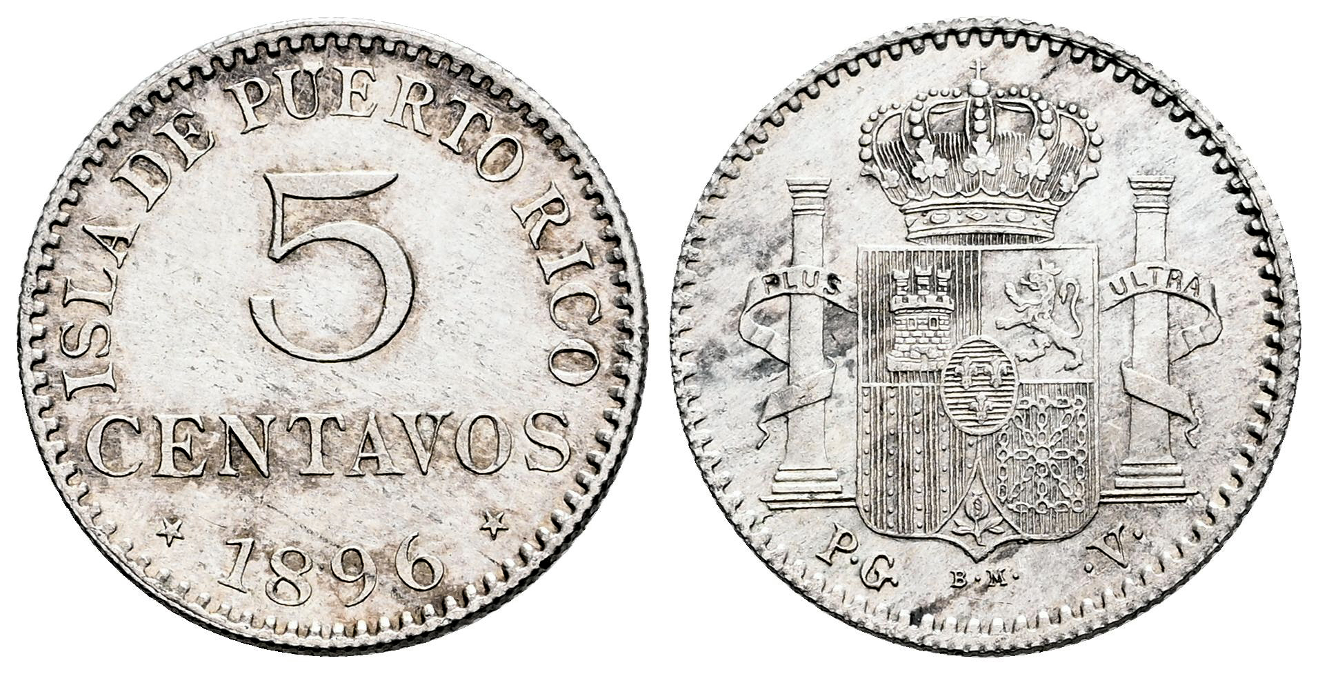 Centenario de la Peseta (1868-1931). Alfonso XIII (1886-1931). 5 centavos. 1896. Puerto Rico. PGV. (Cal-124). Ag. 1,25 g. Suaves rayitas. Restos de brillo original. EBC. Est...90,00.