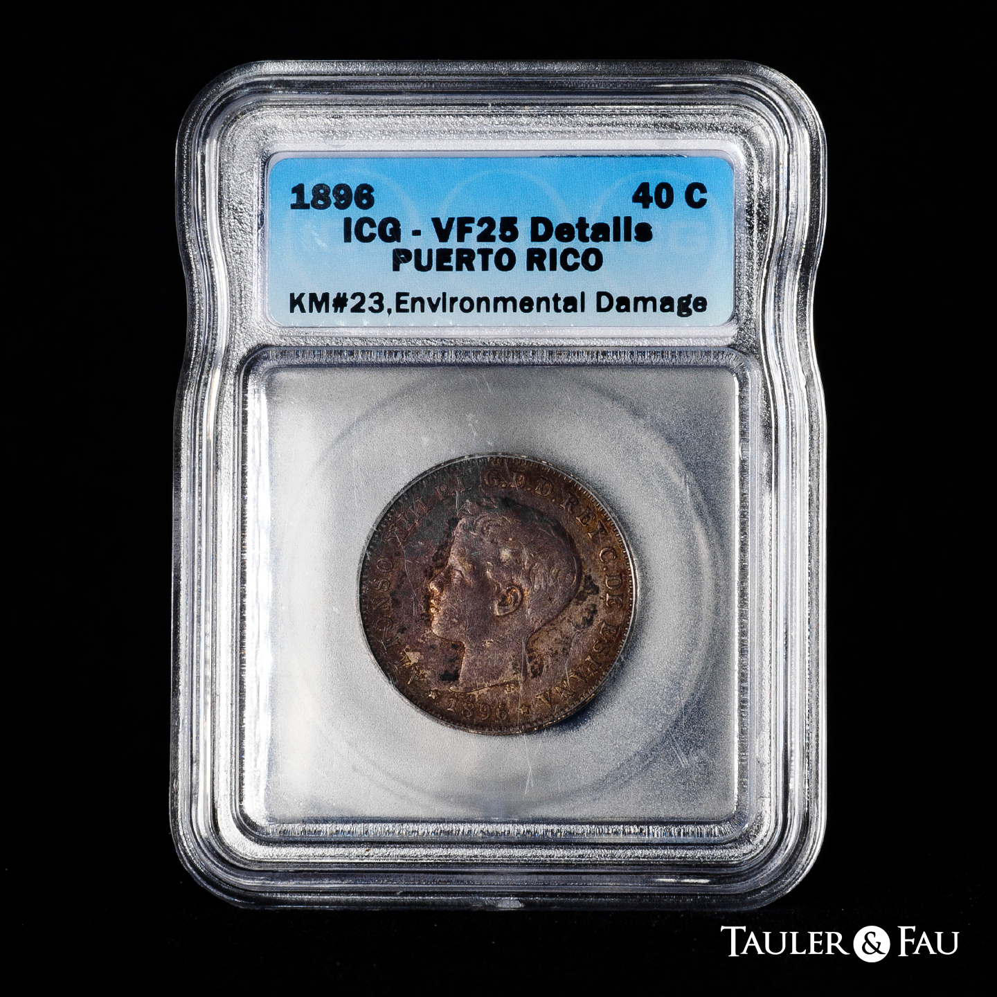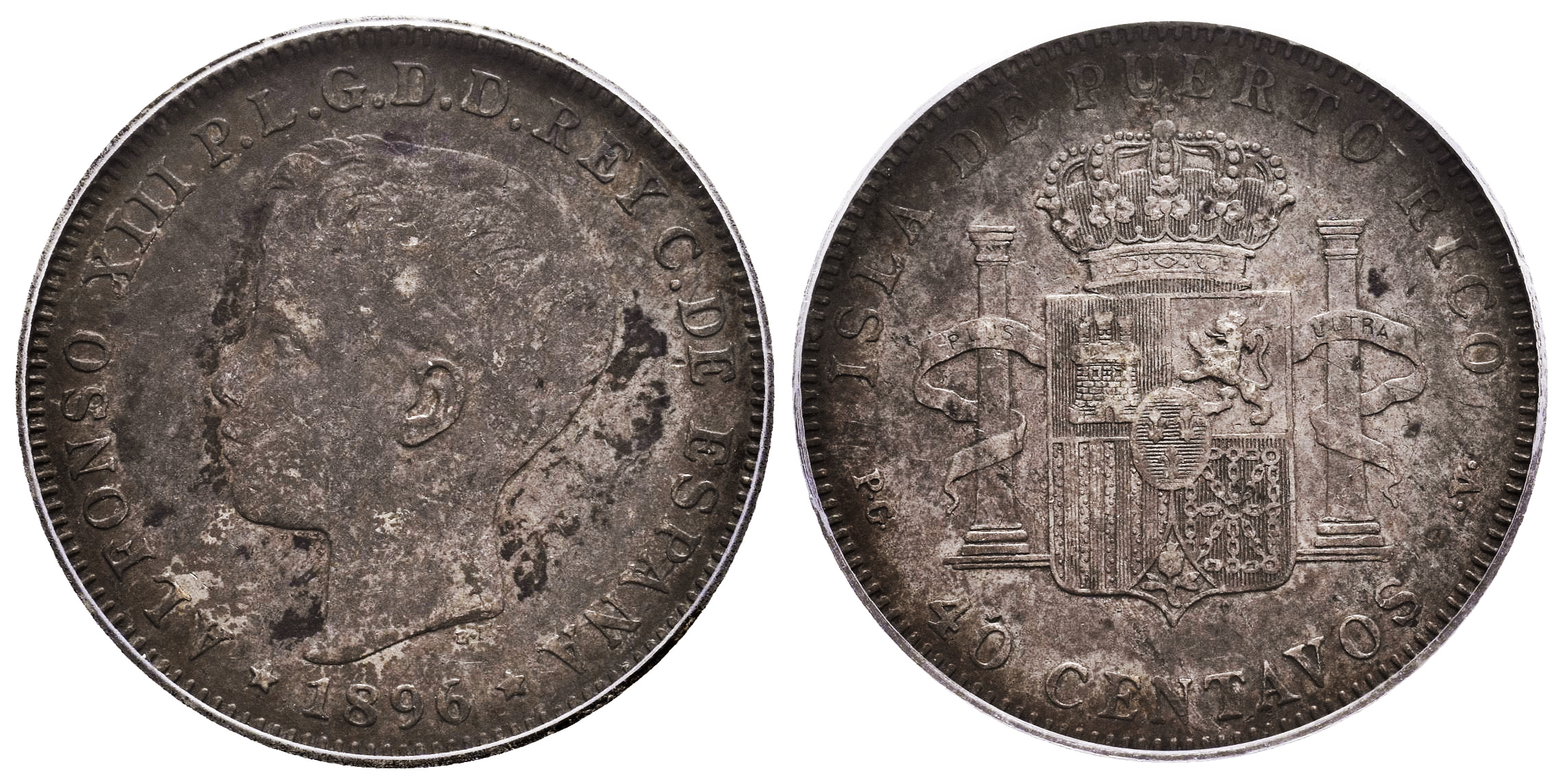 Centenario de la Peseta (1868-1931). Alfonso XIII (1886-1931). 40 centavos. 1896. Puerto Rico. PGV. (Cal-127). Ag. Rara. Encapsulada por IGC como VF 25 Details, Environmental damge. MBC. Est...300,00.