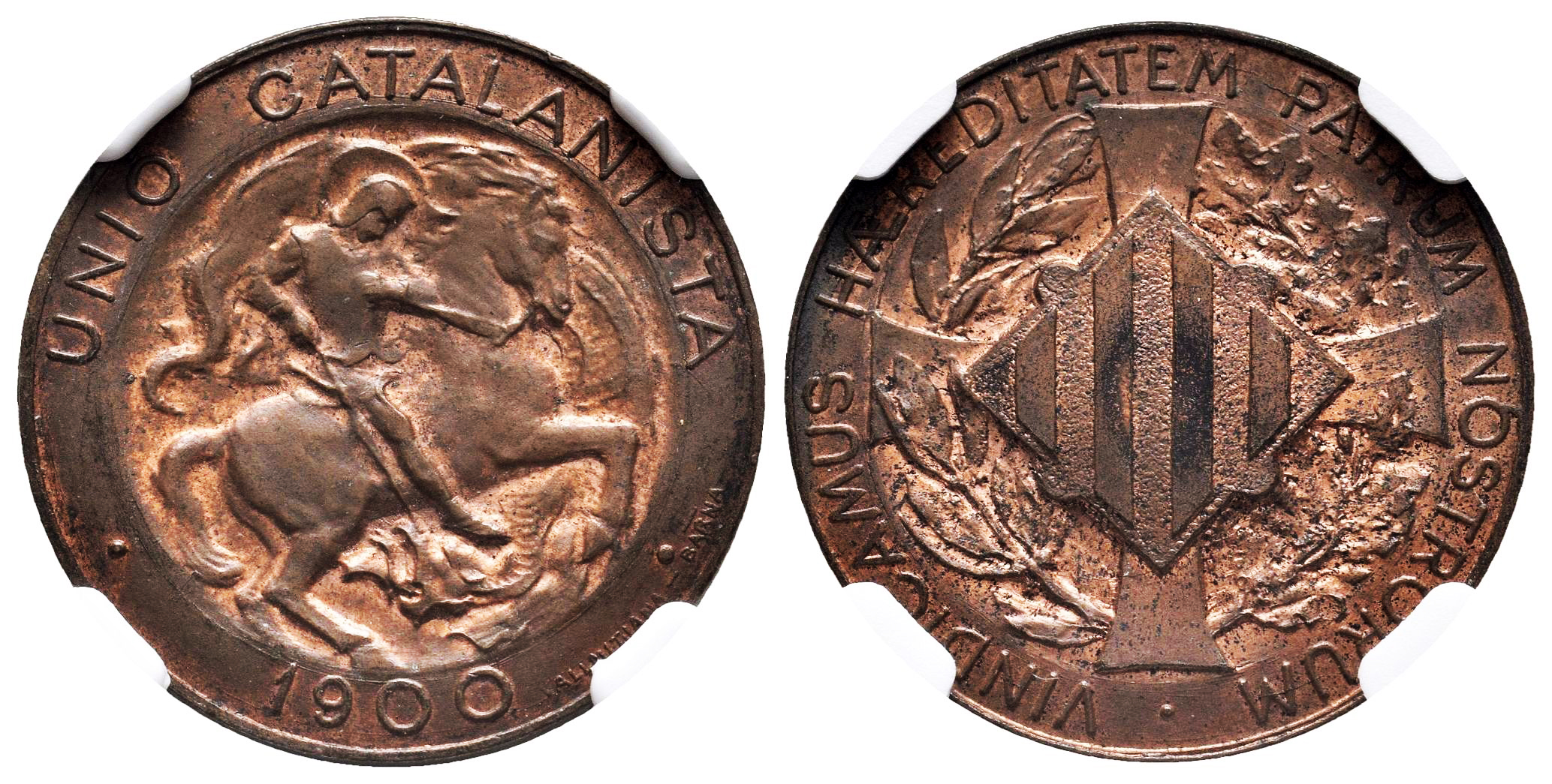 Centenario de la Peseta (1868-1931). Alfonso XIII (1886-1931). 5 céntimos. 1900. Unión Catalanista. (Cal-132). Au. Encapsulada por NGC como MS 63 BN. Solamente 1 ejemplar mejor conservado según el censo de NGC. Est...200,00.