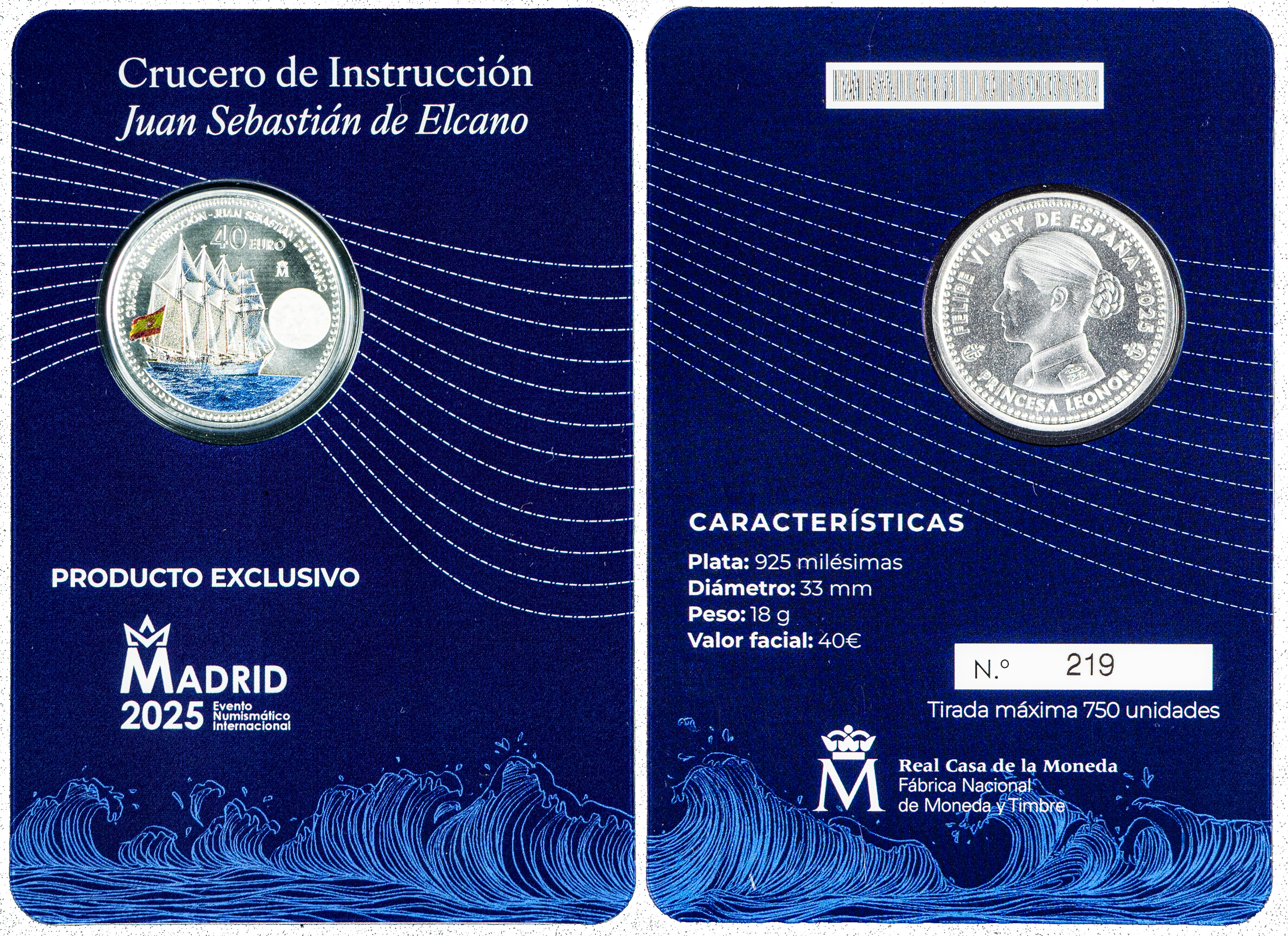 Felipe VI. 40 euros. 2025. Cartera exclusiva de FNMT "Juan Sebastián de Elcano" y la "Princesa Leonor". Ag. 18,00 g. Tirada de 750 unidades. Est...150,00.