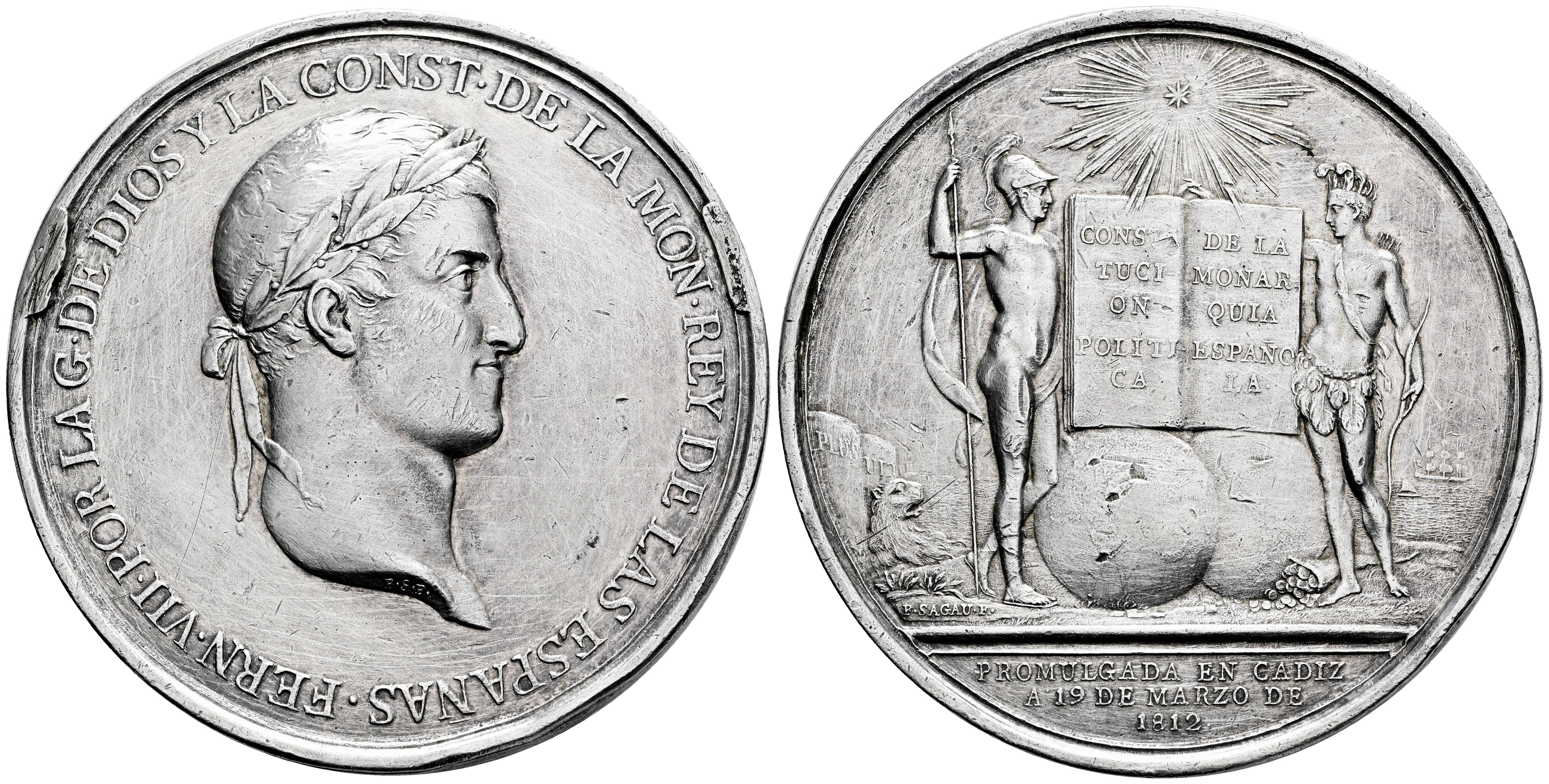 Fernando VII (1808-1833). Medalla. 1812. Cádiz. (Vives-290). (Herrera-no cita). Ag. 71,29 g. Constitución Cádiz 1812. Por: F.S. F en el corte y F. Sagau en reverso. 56 mm. Rayas de limpieza. MBC+/EBC-. Est...160,00.