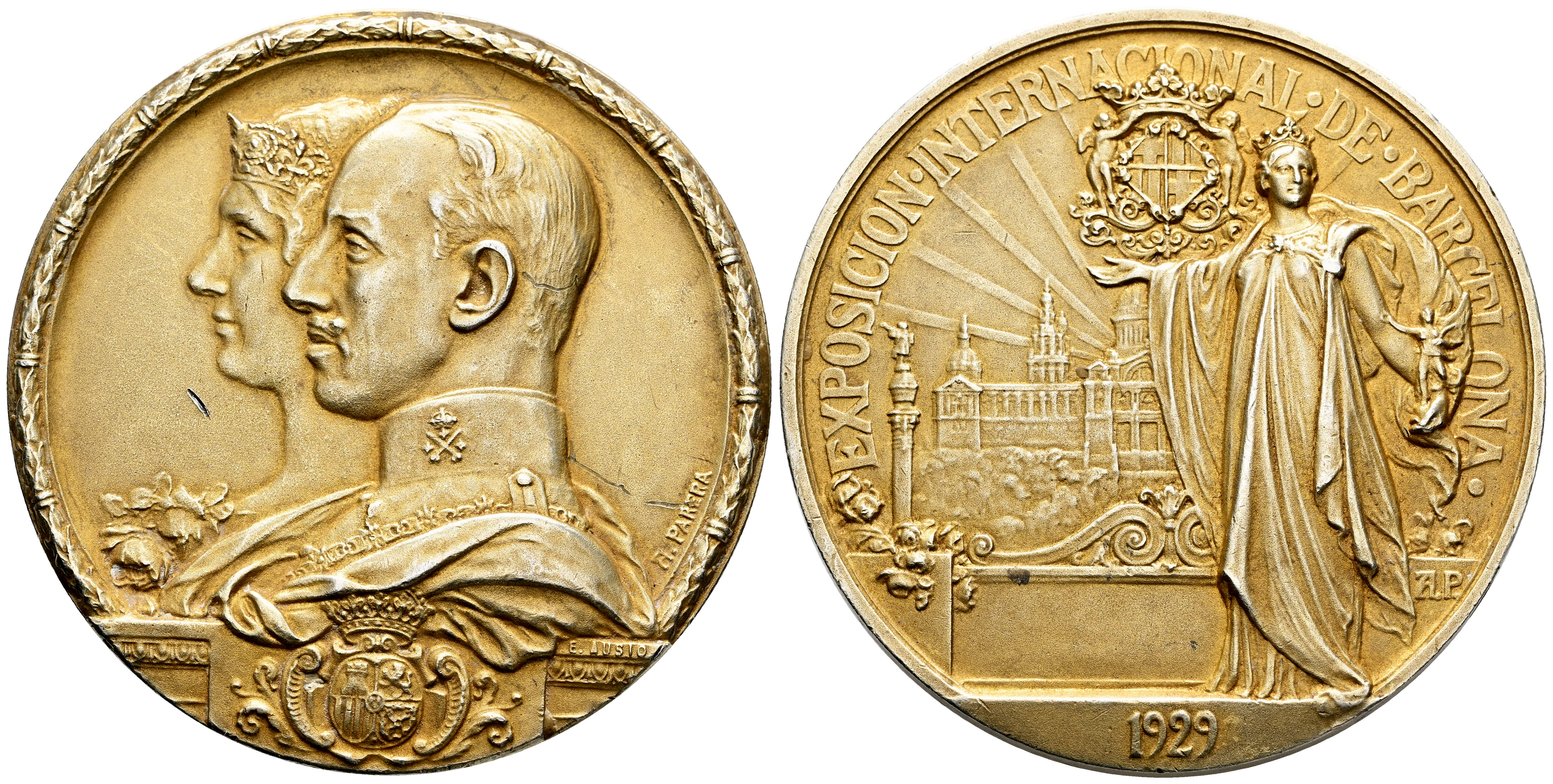Alfonso XIII (1886-1931). Medalla. 1929. Barcelona. Ag. 74,35 g. Exposición Internacional de Barcelona. Alguna rayita en anverso. Plata dorada. Grabador: A. Parera. 50 mm. EBC. Est...150,00.