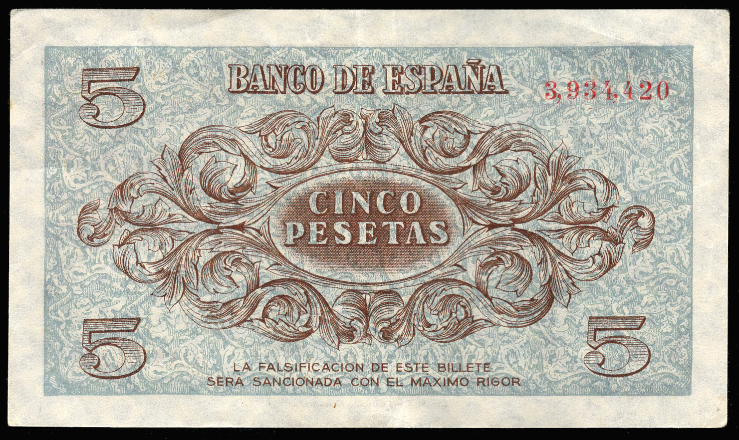5 pesetas. 1936. Burgos. (Ed-417). 21 de noviembre, por José López Sánchez Toda. Doblez central y pliegues de papel. Pequeñas roturas ligeramente reparadas en los márgenes. Raro. MBC+. Est...500,00.