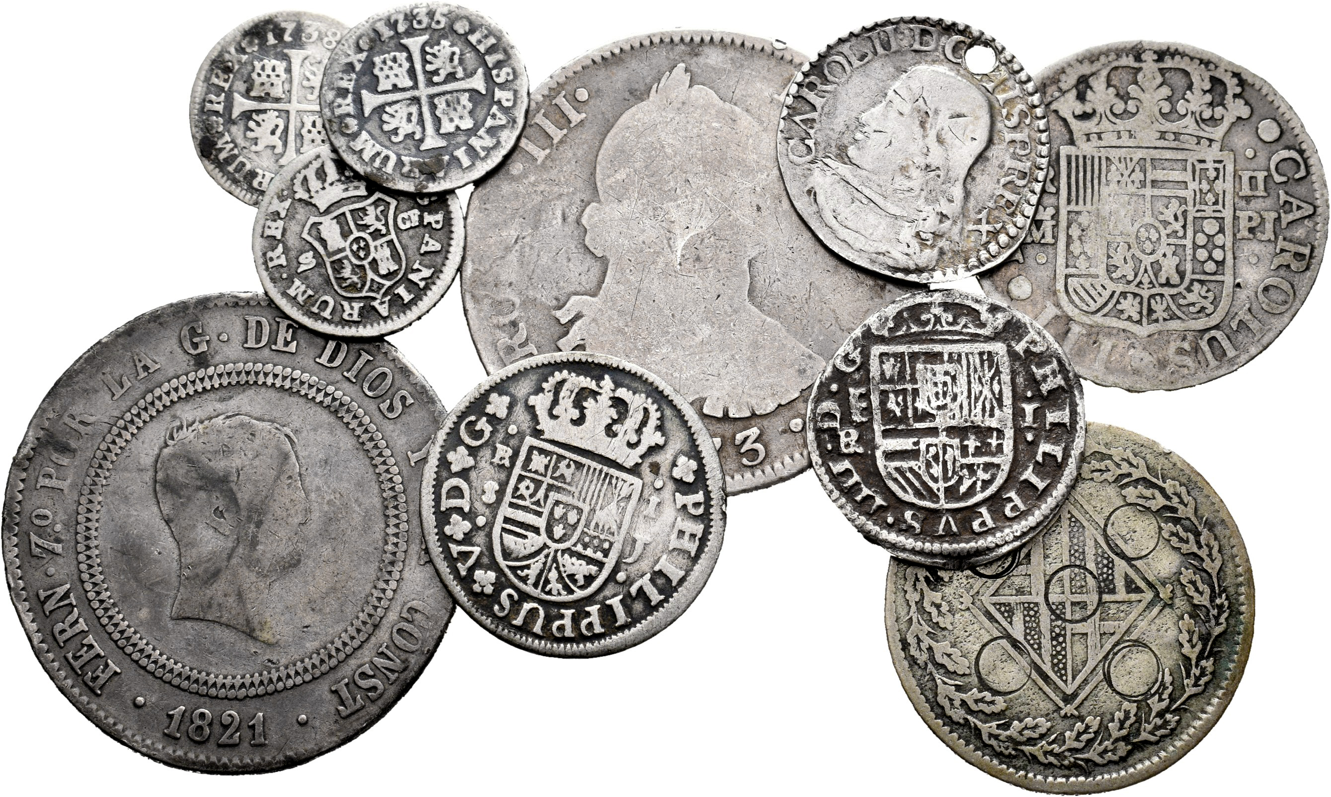 Lote de 10 monedas de Monarquía Española. Conteniendo gran variedad de valores, cecas y fechas, comprendiendo desde Carlos II a José Napoleón. Algunas con manipulaciones o perforaciones. Ag. Es imprescindible un riguroso examen. SOLO ENVÍO A ESPAÑA PENÍNSULA. NO SE ADMITE DEVOLUCIÓN. BC+/MBC. Est...160,00.
