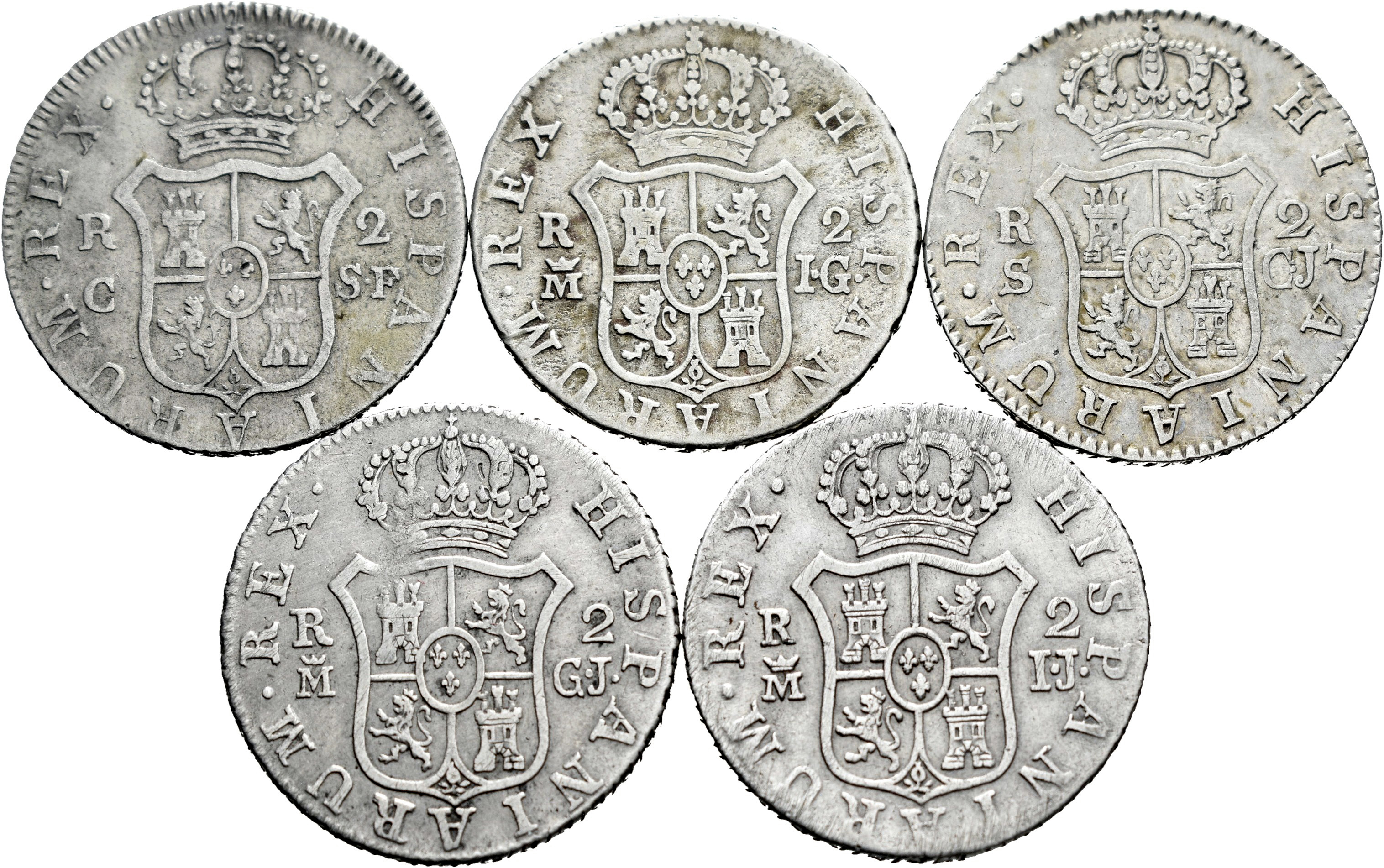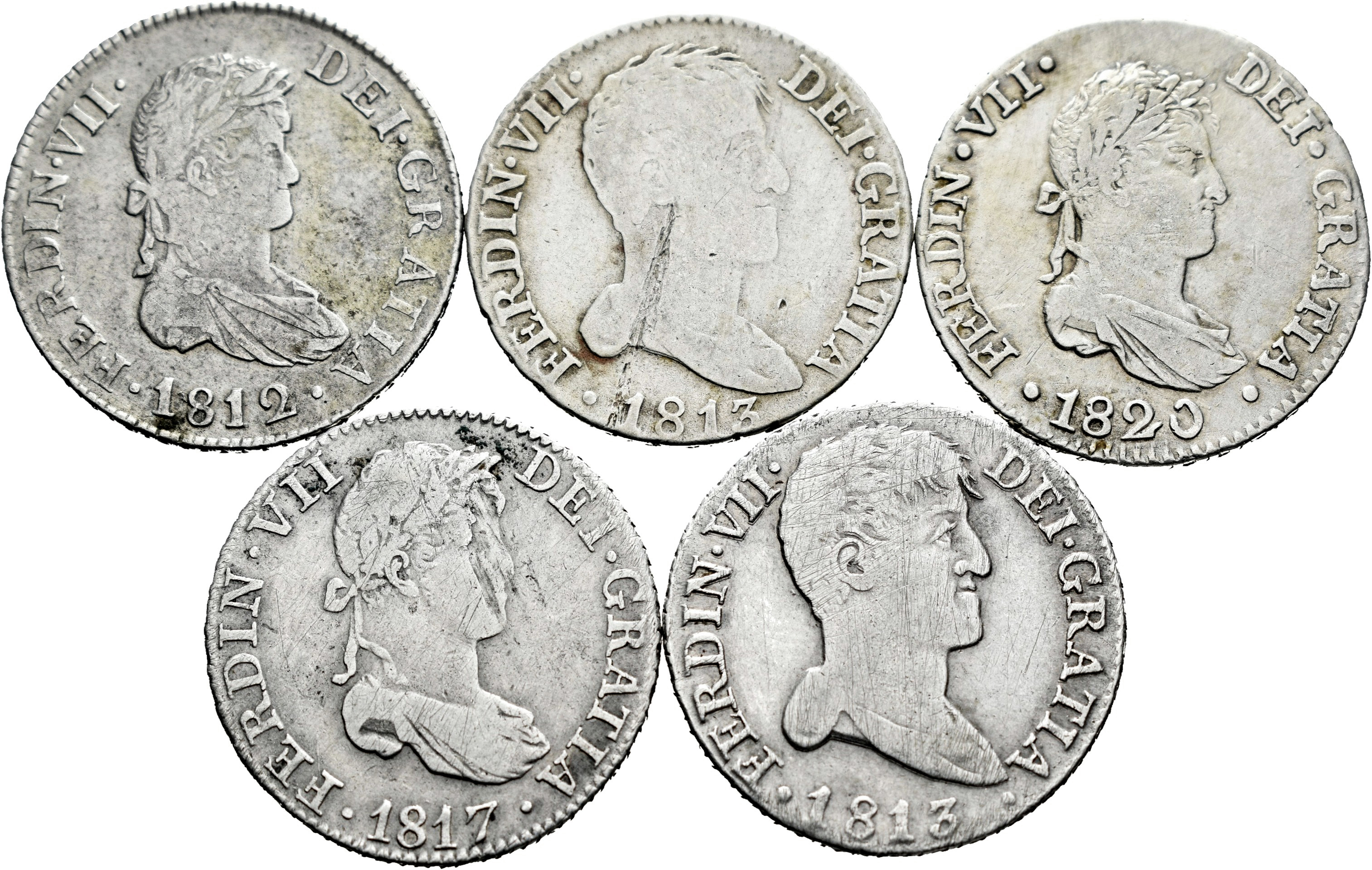 Lote de 5 monedas de Fernando VII. 2 Reales de Madrid 1813 IG e IJ, 1817 GJ; Cataluña 1812 SF y Sevilla 1820 CJ. Ag. Es imprescindible un riguroso examen. SOLO ENVÍO A ESPAÑA PENÍNSULA. NO SE ADMITE DEVOLUCIÓN. BC+/MBC. Est...250,00.