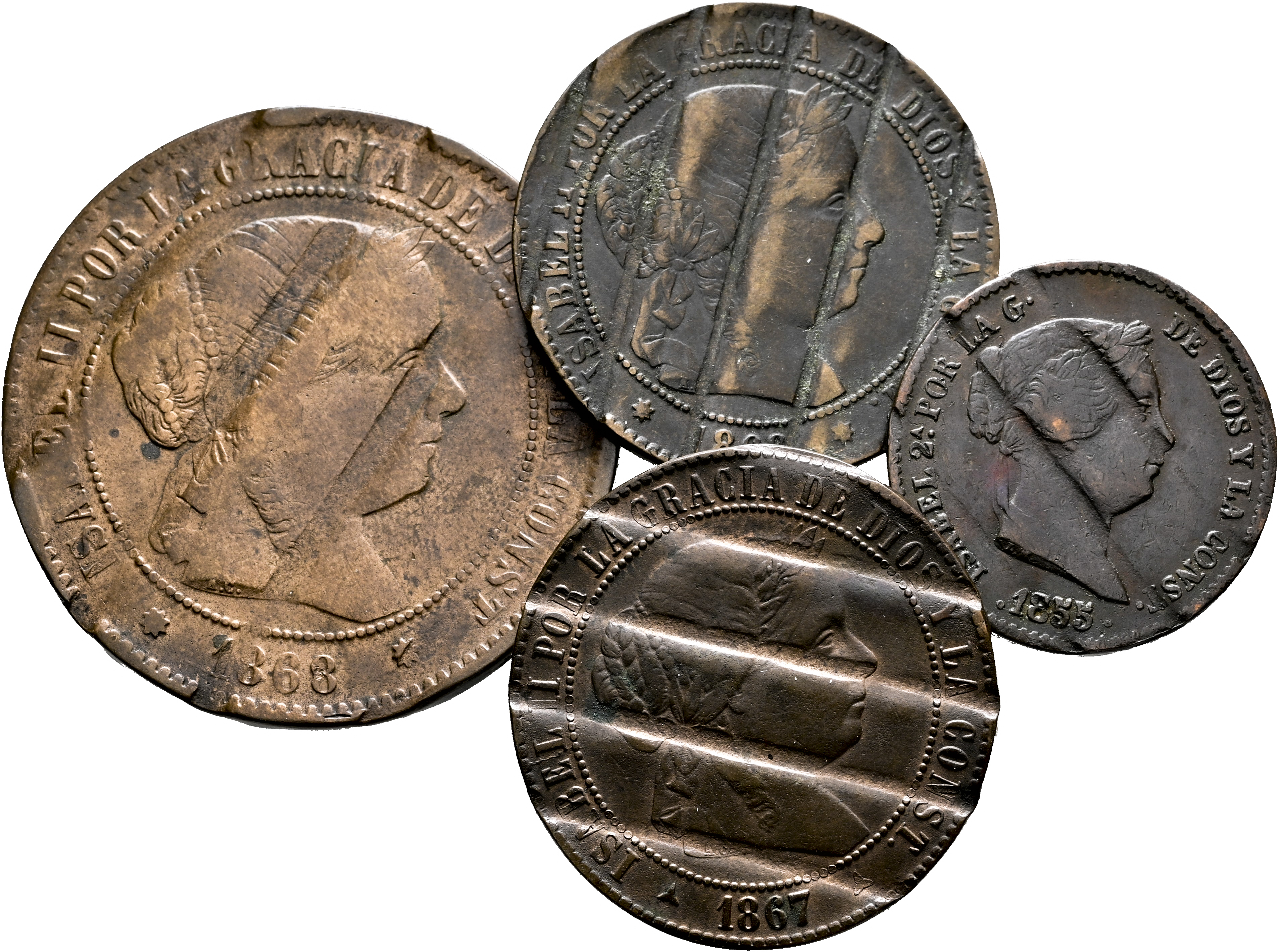 Lote de 4 monedas de Isabel II. Compuesto por 10 Cent. 1855 Segovia; 2 1/2 Cent. 1867 Jubia; 2 1/2 Cent. 1868 Sevilla y 5 Cent. 1868 Barcelona, Todas desmonetizadas. Interesante conjunto. Ae. Es imprescindible un riguroso examen. SOLO ENVÍO A ESPAÑA PENÍNSULA. NO SE ADMITE DEVOLUCIÓN. MBC/MBC+. Est...120,00.