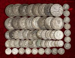 Lote de 58 piezas de plata, 1 de Isabel II (40 céntimos de escudo 1865 Madrid) y 57 del Centenario de la Peseta: 20 de 50 céntimos (1880 (10), 1881, 1885), 9 de 1 peseta (1870 (2), 1876, 1882, 1894, 1896, 1899, 1901, 1903), 12 de 2 pesetas (1869, 1870 (4), 1879, 1881, 1882, 1883, 1899, 1892, 1905), 16 de 5 pesetas (1870, 1871(2), 1875 , 1876, 1878, 1879, 1882, 1885, 1989, 1890, 1891, 1894, 1897, 1898, 1899). Es imprescindible un riguroso examen. SOLO ENVÍO A ESPAÑA PENÍNSULA. NO SE ADMITE DEVOLUCIÓN. BC/MBC. Est...500,00.