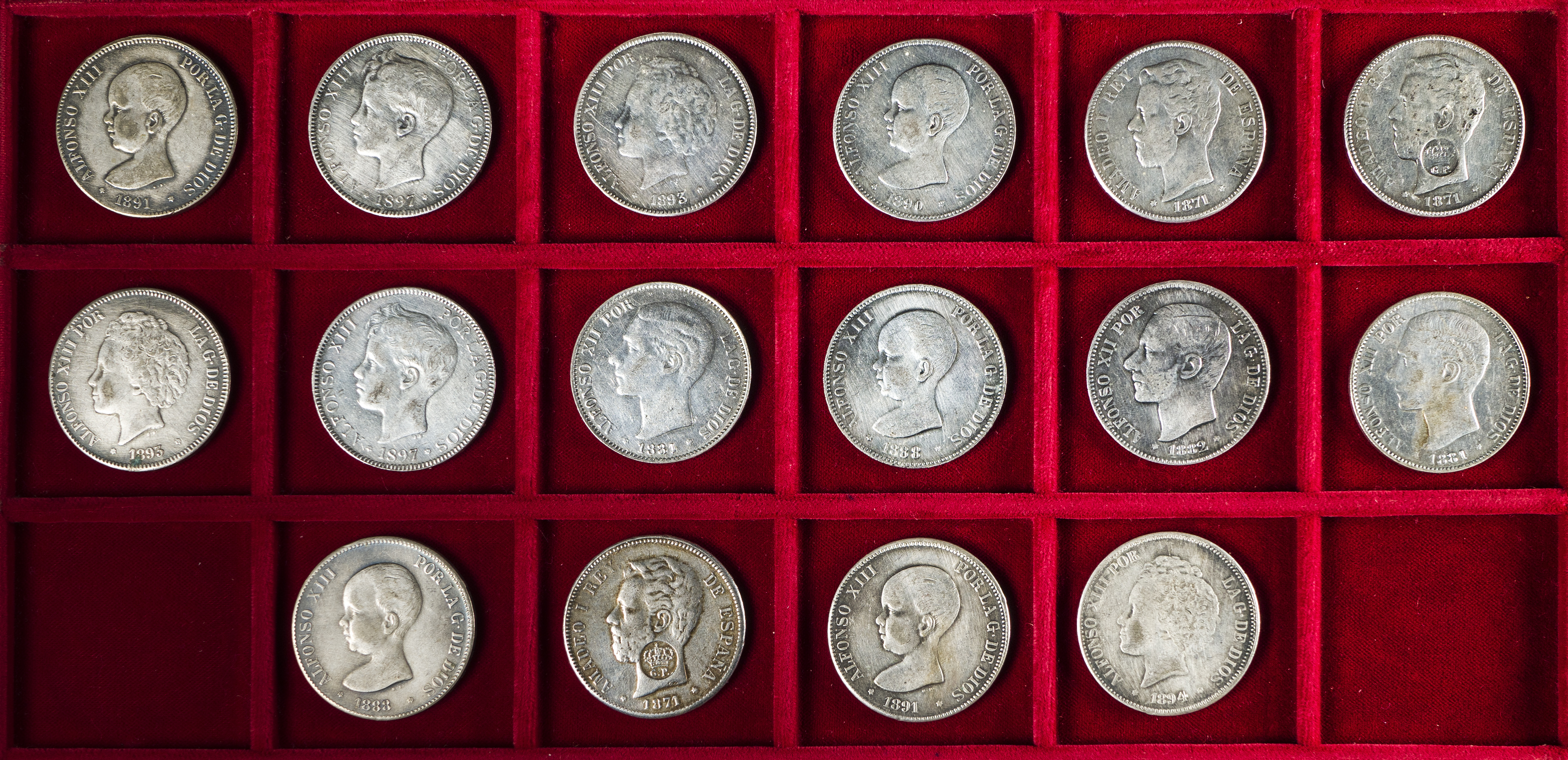 Lote de 16 monedas de 5 pesetas del Centenario falsas de época. Ag. Es imprescindible un riguroso examen. SOLO ENVÍO A ESPAÑA PENÍNSULA. NO SE ADMITE DEVOLUCIÓN. Est...300,00.