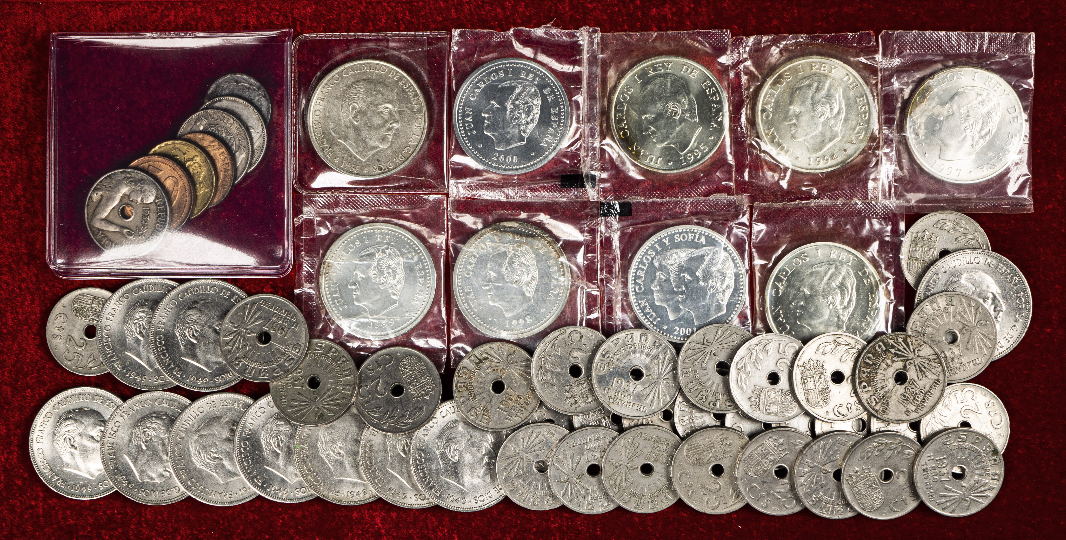 Lote de 56 monedas españolas modernas; 7 de la II República 5 céntimos 193, 25 céntimos 1934, 25 céntimos 1938, 50 céntimos 19737, 1 peseta 1931, 1 peseta 1933 (2), 41 de Francisco Franco 25 céntimos 1937 (30), 10 de 5 pesetas (1949*50)2 de 100 pesetas 1966*19-70), 8 de 2000 pesetas Juan Carlos I en su envoltorio original (1894 a 2001). Es imprescindible un riguroso examen. SOLO ENVÍO A ESPAÑA PENÍNSULA. NO SE ADMITE DEVOLUCIÓN. MBC+/SC. Est...300,00.