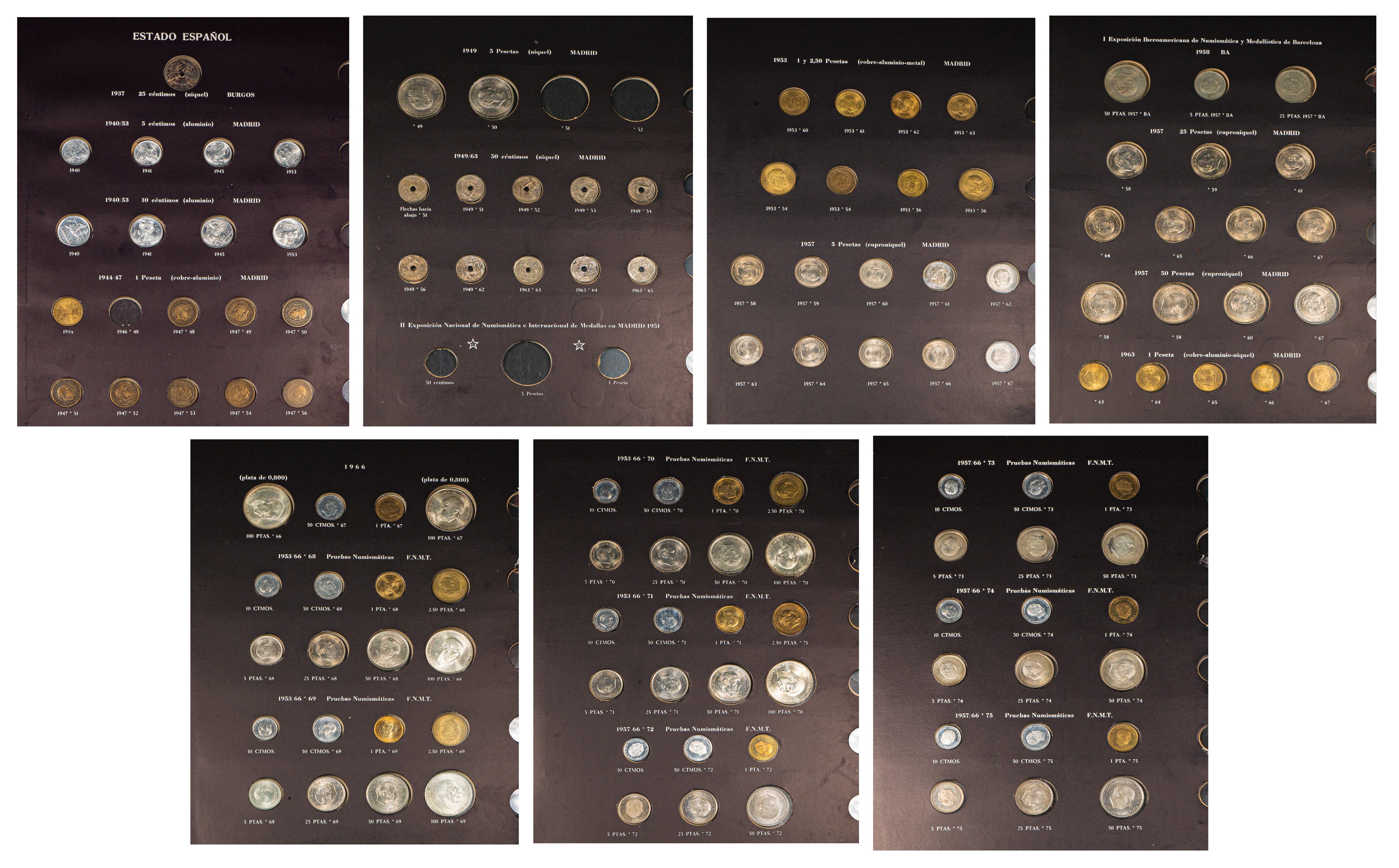 Álbum del Estado Español con 127 piezas heterogéneas. Falta 1 peseta 1946, 5 pesetas 1951, 1952 y la Serie BA. Los 10 céntimos de 1940 y 1941, ambos con leyenda PLUS. Las 100 pesetas de 1966*19-69, palo recto. Muy interesante y una gran oportunidad. Es imprescindible un riguroso examen. SOLO ENVÍO A ESPAÑA PENÍNSULA. NO SE ADMITE DEVOLUCIÓN. MBC/SC. Est...1000,00.