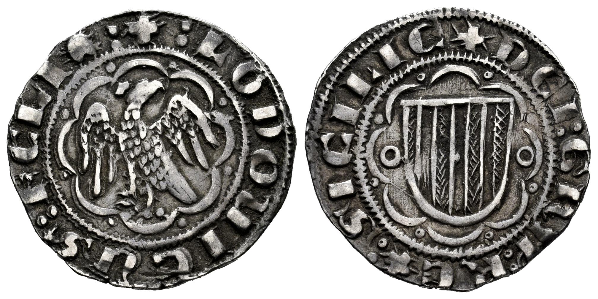 Corona de Aragón. Luis I de Sicilia (1342-1355). Pirral. Messina. (Cru-608). (Cru C.G-2583). (Mir-190). Anv.: + :LODOVICVS : FELIX :. Rev.: + DEI : GRA : REX : SICILIE. Ag. 3,24 g. Roel a cada lado del escudo. Pátina. MBC+. Est...150,00.