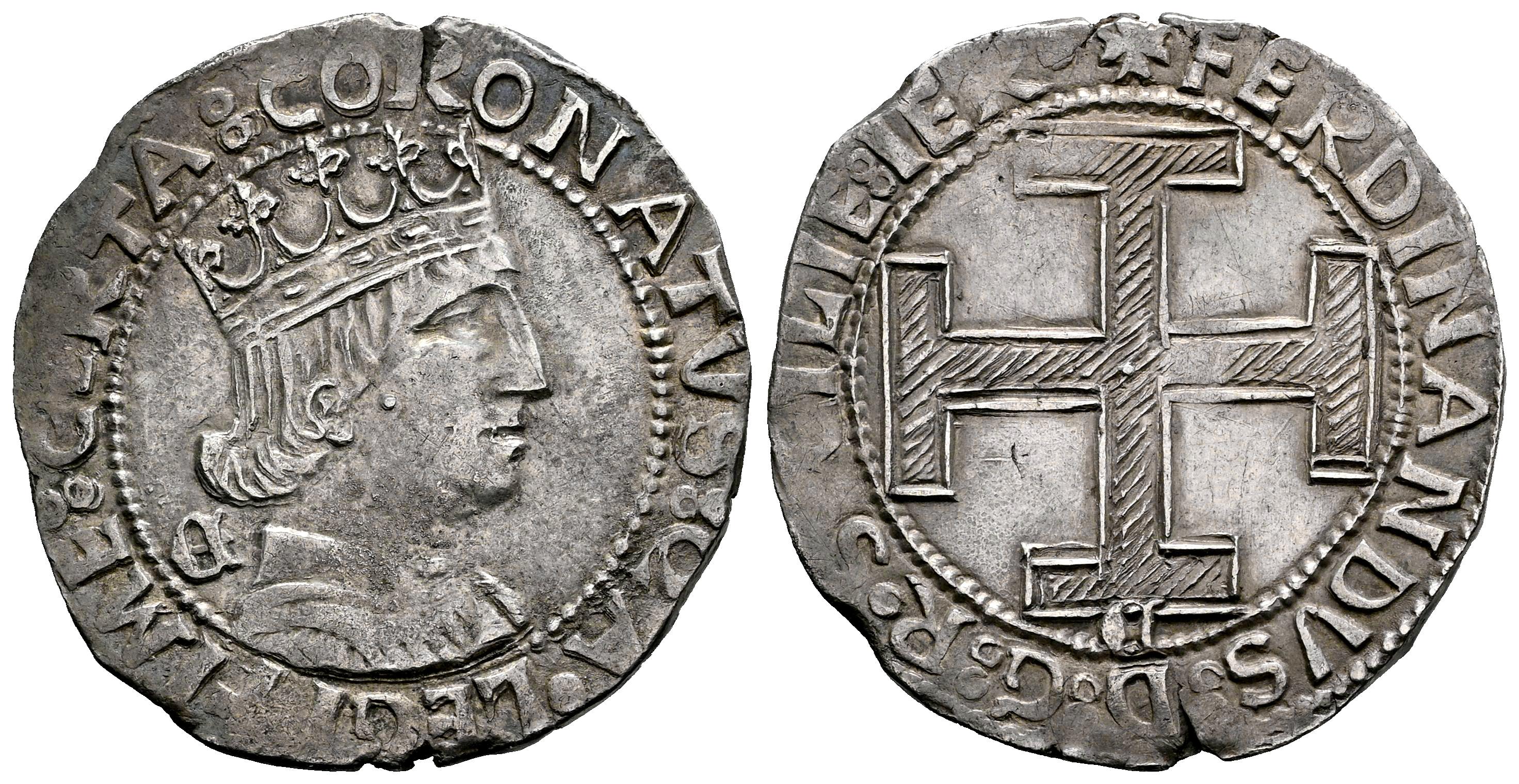 Corona de Aragón. Fernando I de Nápoles (1458-1494). Coronato. Nápoles. (Cru V.S-1007 var.). (Pannuti-Riccio-15g). (CNI-XIX 290 ff). Anv.: CORONATVS : QA : LEGITIME : CERTA : . Rev.: + FERDINANDVS : D : G : R : SICILIE : IER · . Ag. 3,92 g. Marca C en anverso y reverso. MBC+. Est...220,00.