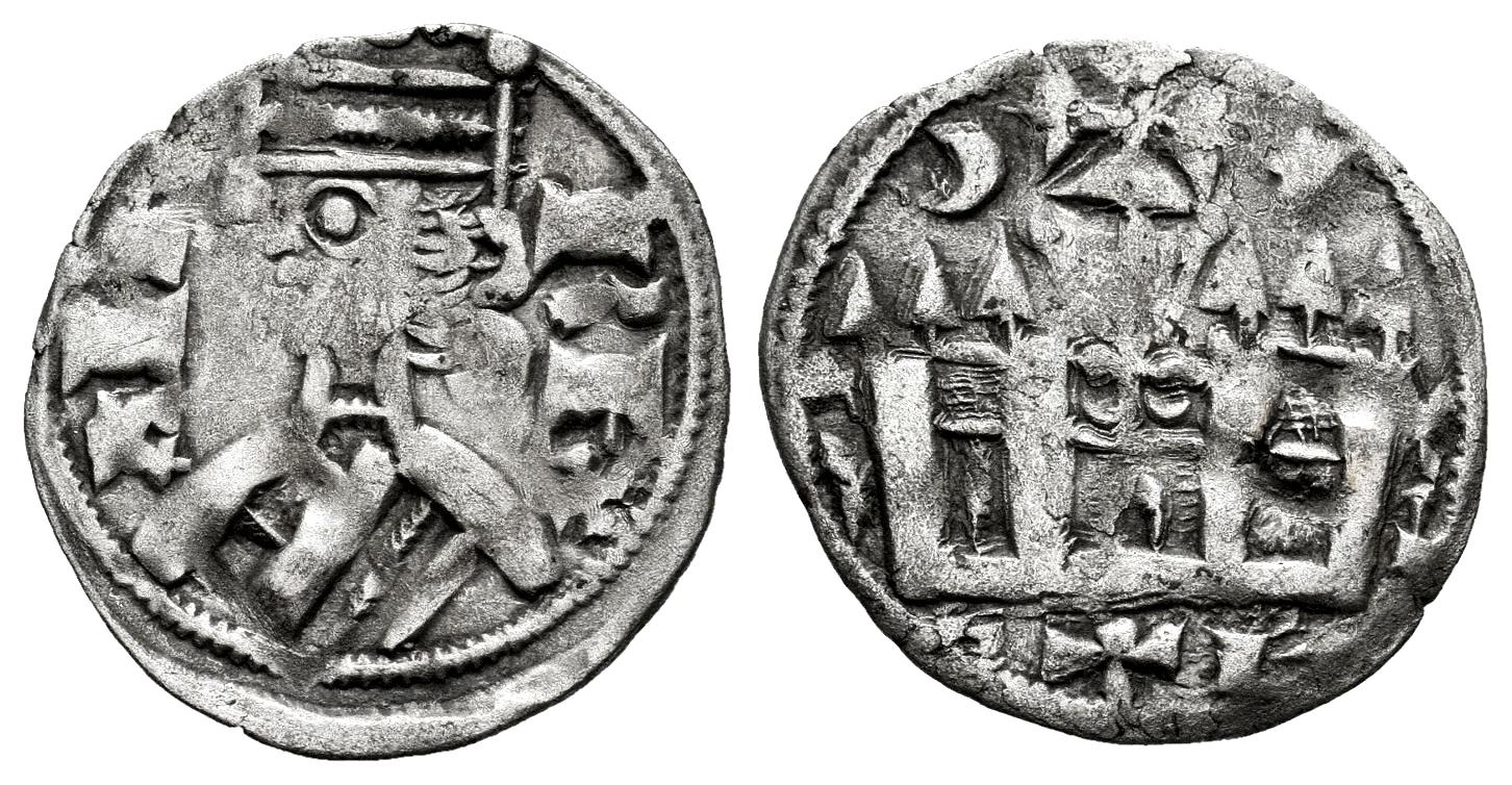 Reino de Castilla y León. Alfonso VIII (1158-1214). Dinero. (Cal-322). Ve. 0,95 g. Creciente y estrella sobre el castillo. MBC+. Est...35,00.