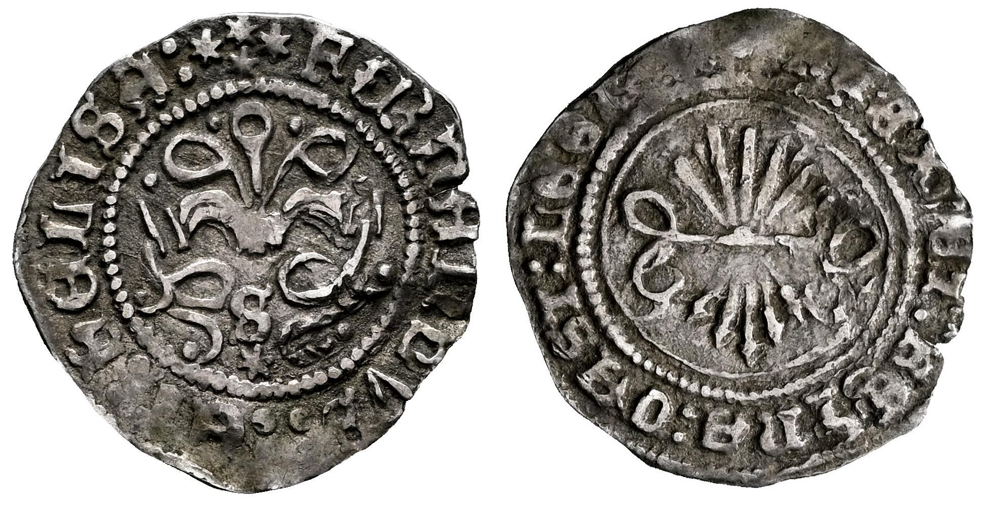 Fernando e Isabel (1474-1504). 1/4 real. Sevilla. (Cal-173). Ag. 0,82 g. S y estrella de 6 puntas bajo el yugo. Algo alabeada. Pátina. Rara. MBC+. Est...350,00.