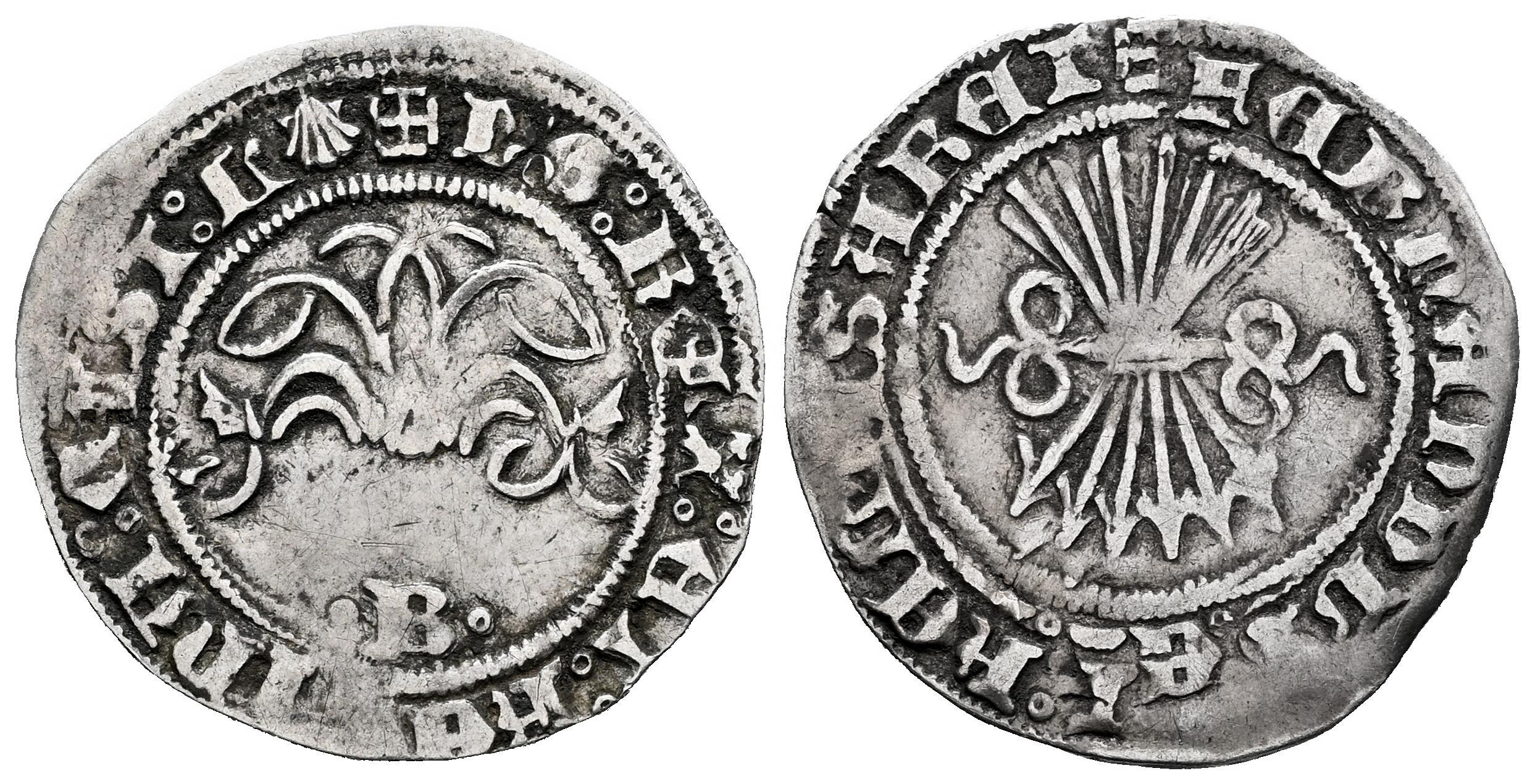 Fernando e Isabel (1474-1504). 1/2 real. Burgos. (Cal-185). Ag. 1,65 g. Venera al final de la leyenda en anverso. B entre roeles vajo el yugo. MBC. Est...150,00.