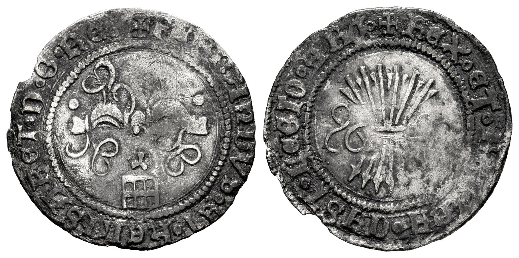 Fernando e Isabel (1474-1504). 1/2 real. Segovia. (Cal-242 var). (Bautista-163). Ag. 1,51 g. Acueducto de tres arcos de dos pisos, encima ¿trébol?. Muy escasa. MBC+. Est...150,00.