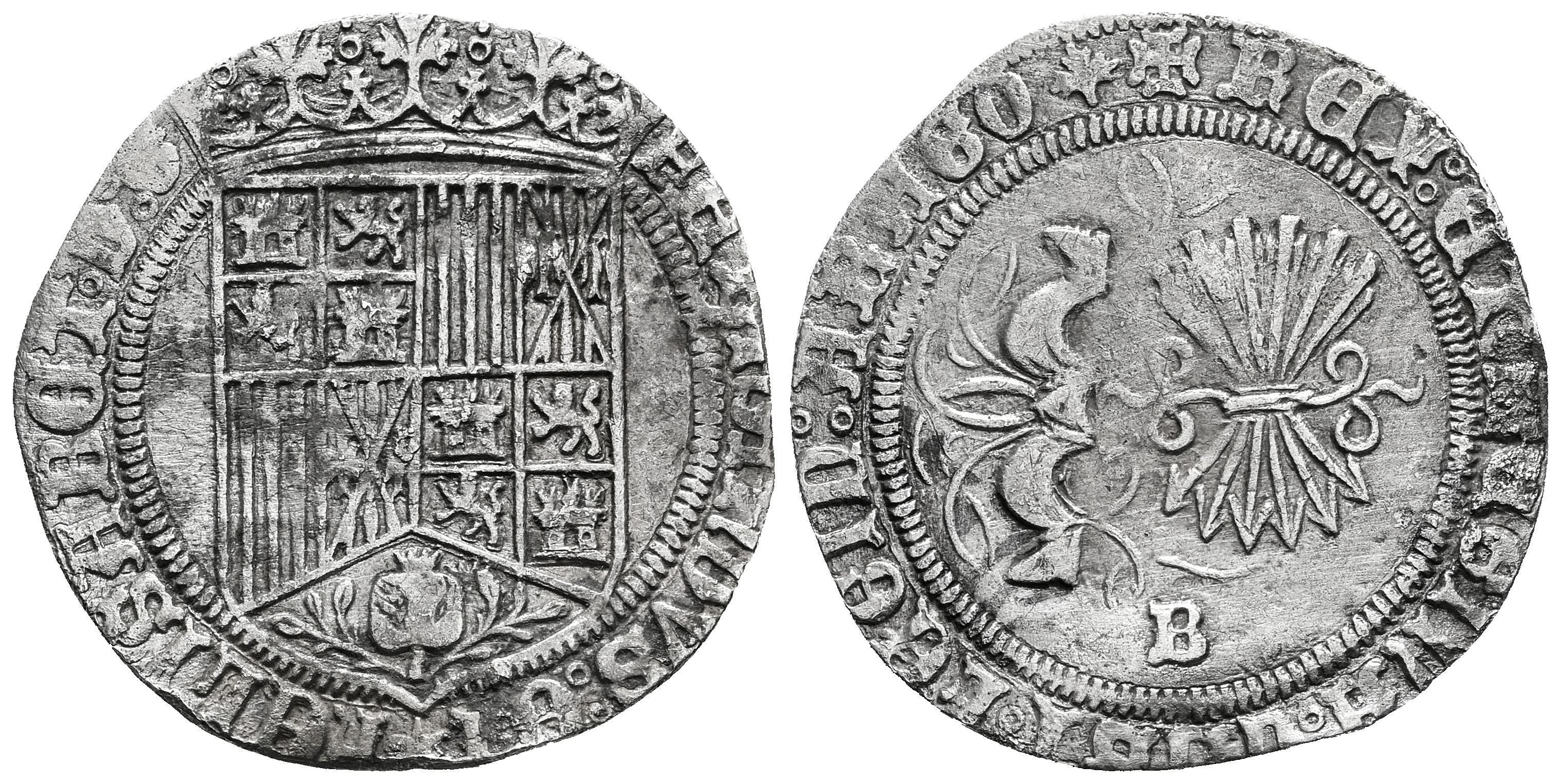 Fernando e Isabel (1474-1504). 1 real. Burgos. (Cal-108). Ag. 2,86 g. Hoja de perejil al final de la leyenda de reverso. Leves oxidaciones superficiales limpiadas y ligeramente alabeada. MBC. Est...90,00.