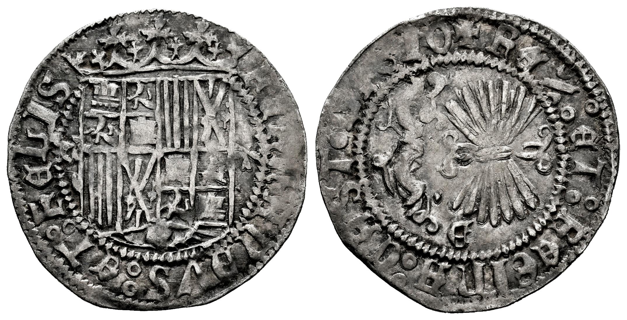 Fernando e Isabel (1474-1504). 1 real. Granada. (Cal-365). Ag. 3,33 g. Adornos cruciformes a los lados del escudo, G en reverso. Escasa. MBC. Est...100,00.