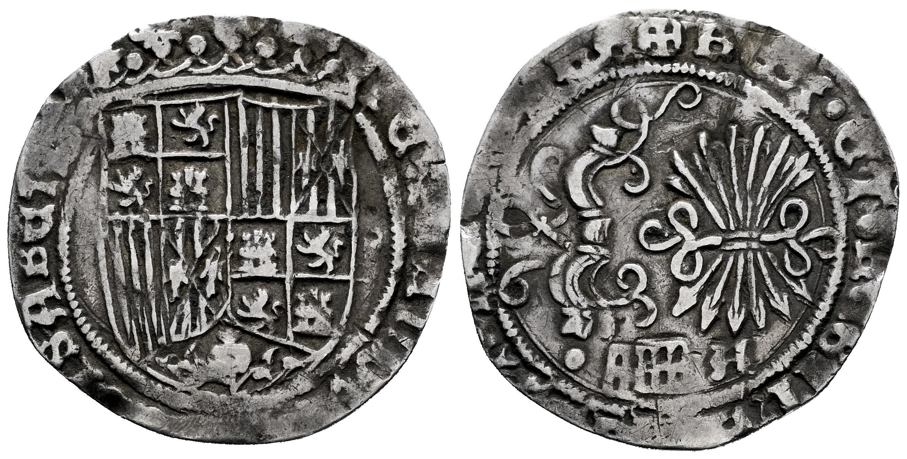 Fernando e Isabel (1474-1504). 1 real. Segovia. A. (Cal-393 var.). (Bautista-1666 var.). Ag. 2,87 g. Acueducto y A bajo el haz de 6 flechas. Golpeada. Rara. MBC-. Est...150,00.